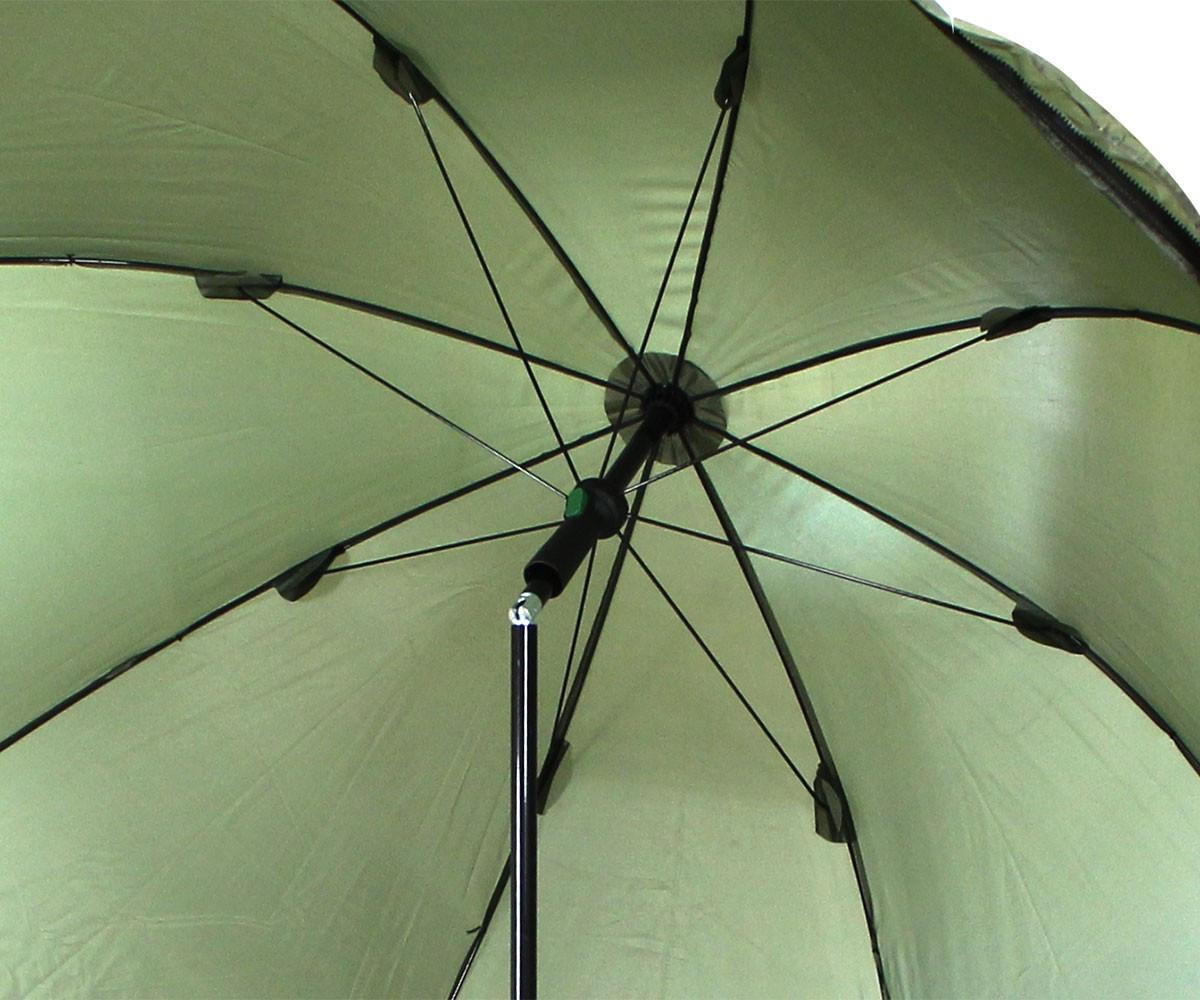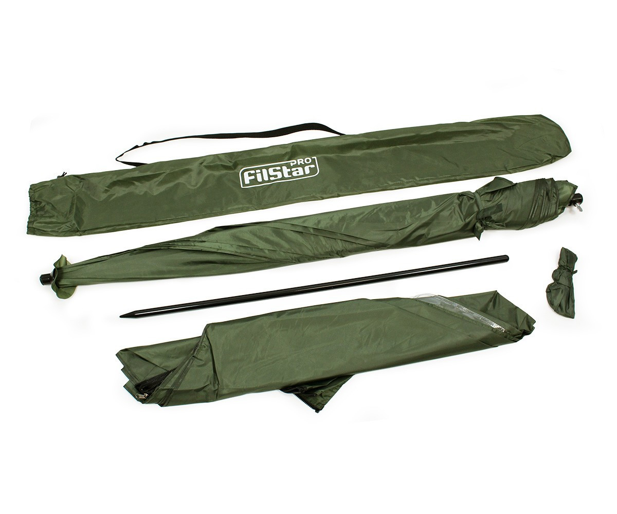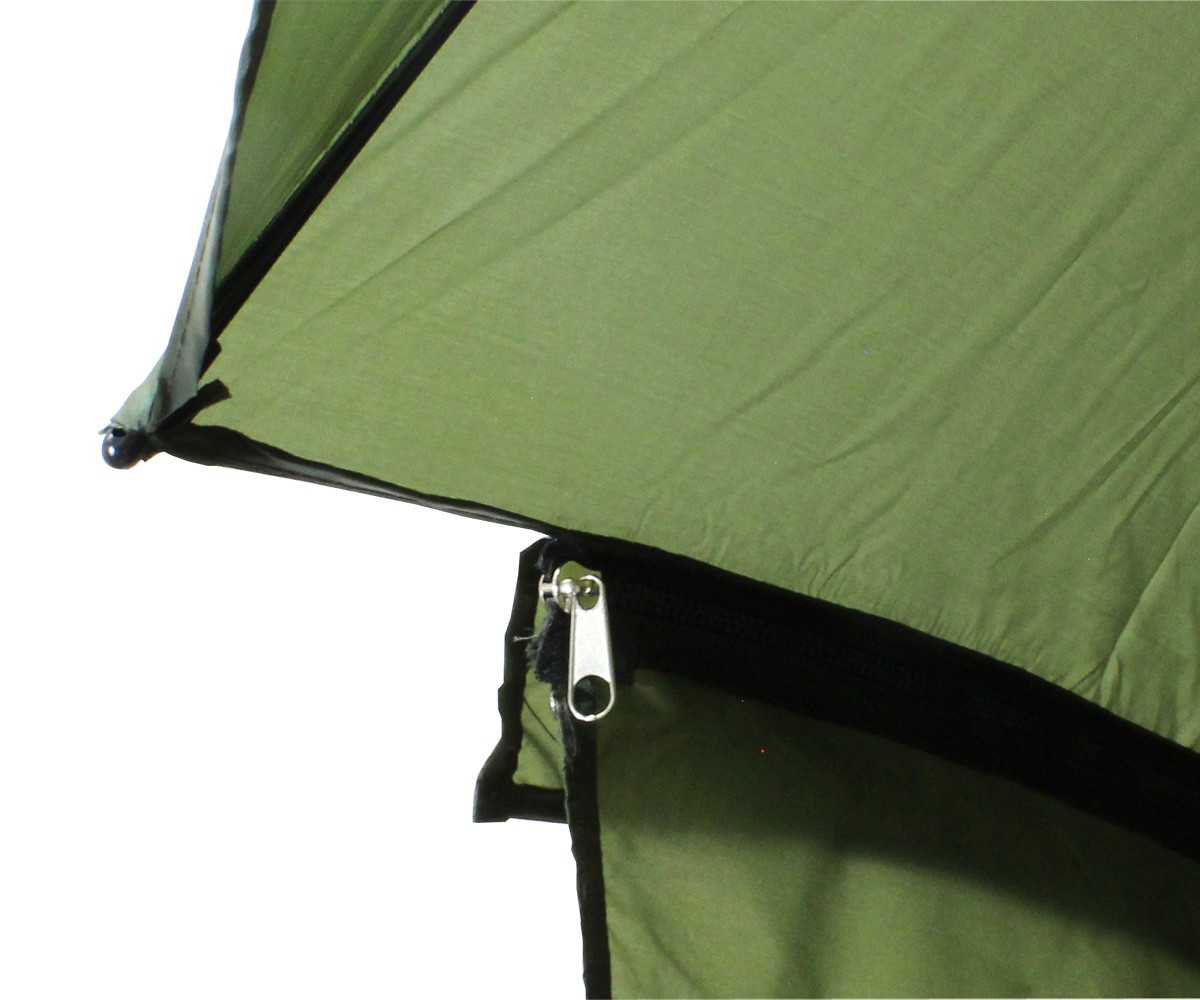 Комбиниран чадър-палатка, оборудван с подвижно странично платнище, което предлага допълнителна защита и комфорт по време на риболов и къмпинг. Прикрепянето на допълнителната стена става с помощта на цип, с който лесно се захваща по краищата на чадъра. Страничното платнище разполага с два прозрачни PVC прозореца и отворен вход. В комплекта има шест въженца и 6 колчета, с които може да изпънете заслона за максимална стабилност при наличие на вятър. Моделът разполага с устойчиви 3.5 мм рейки, може да се регулира по височина до 2 m, а също и да се накланя чрез чупещата основна ос.