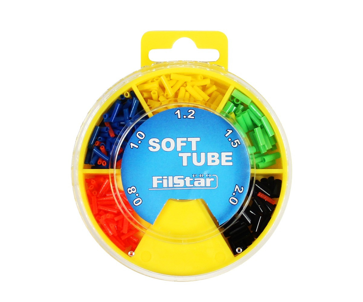 Цветен шлаух за плувки, предлагащ се в кутия-органайзер с 5 различни варианта на диаметър - 0.8, 1.0, 1.2, 1.5 и 2.0 mm.