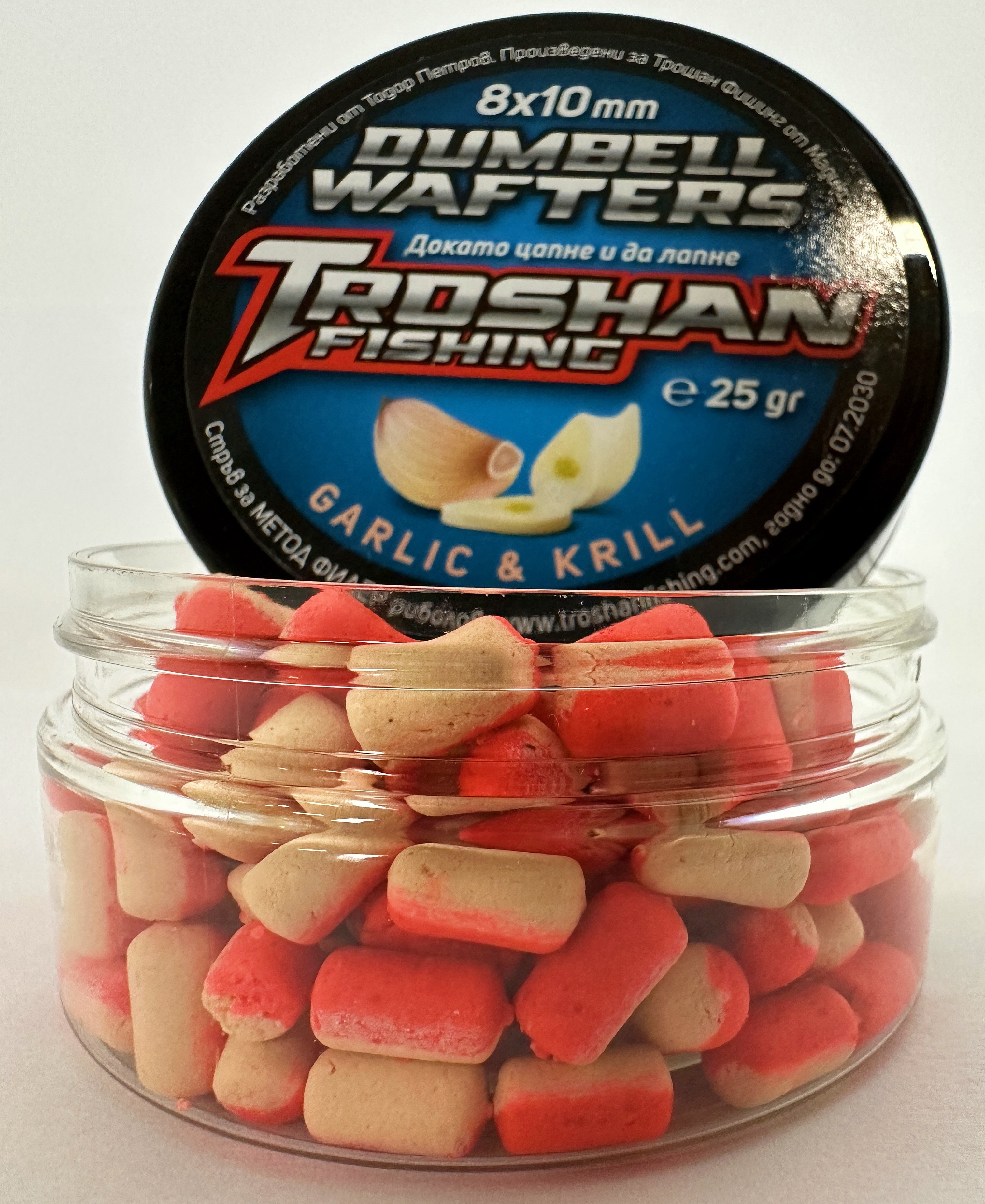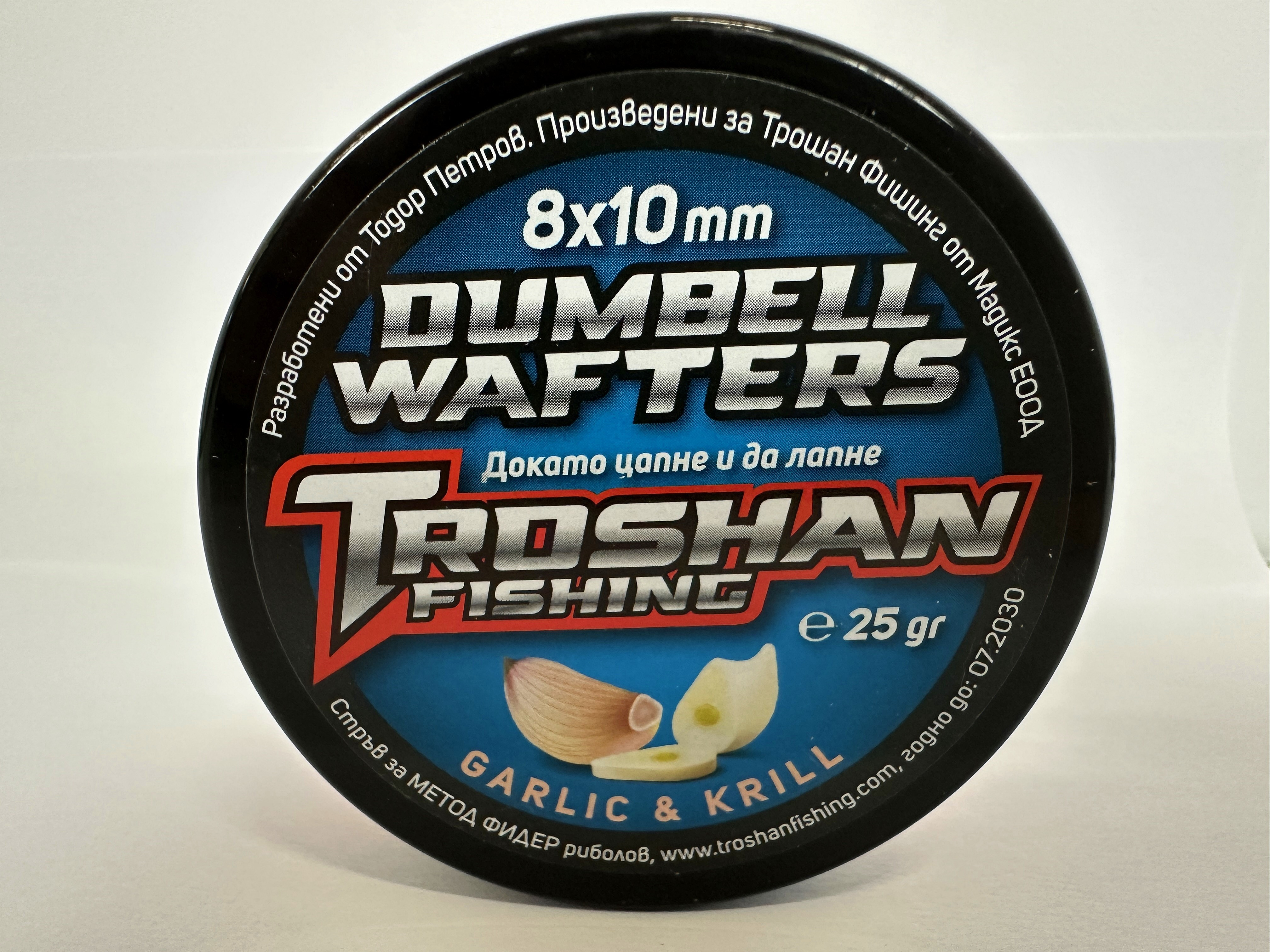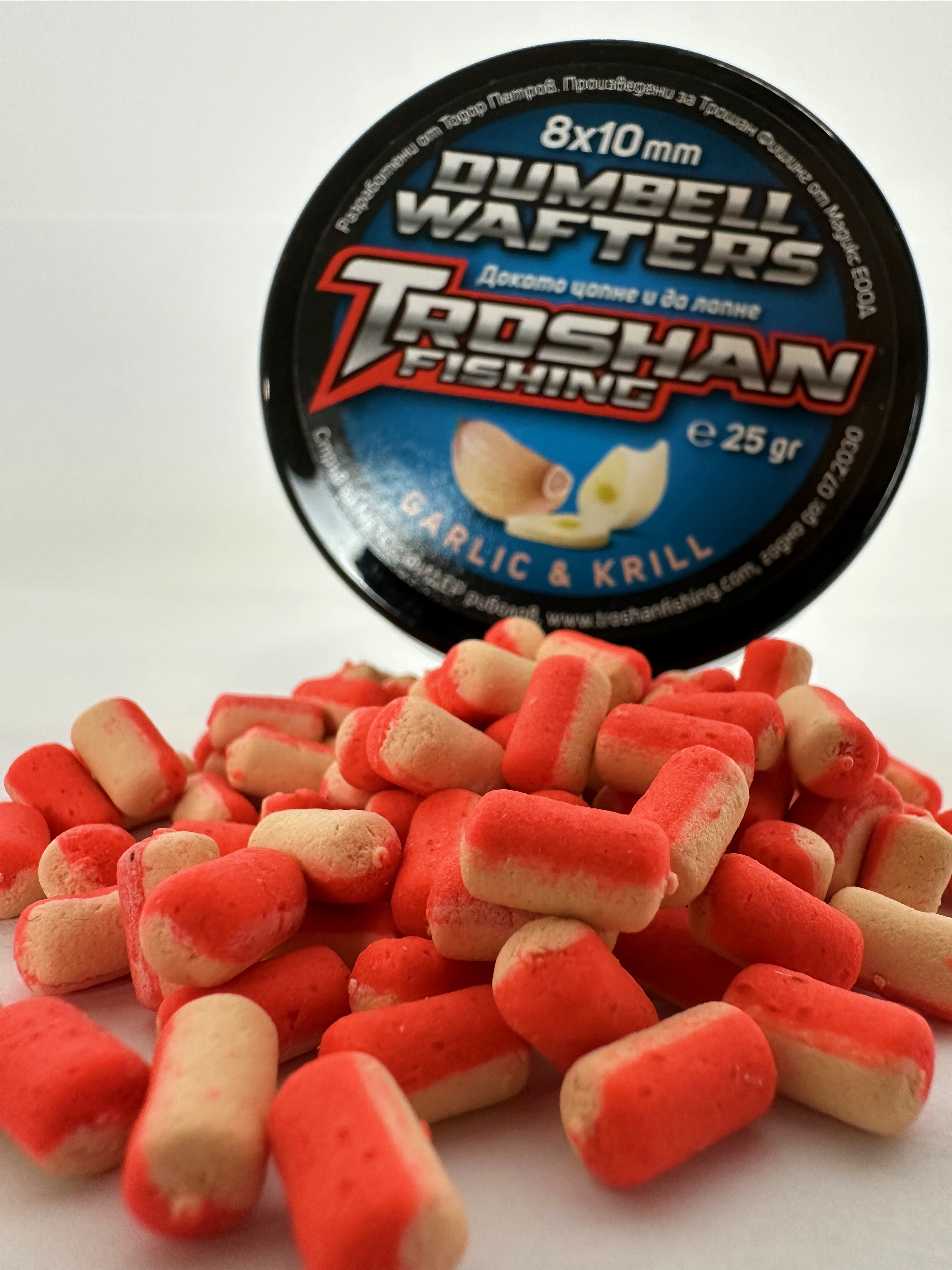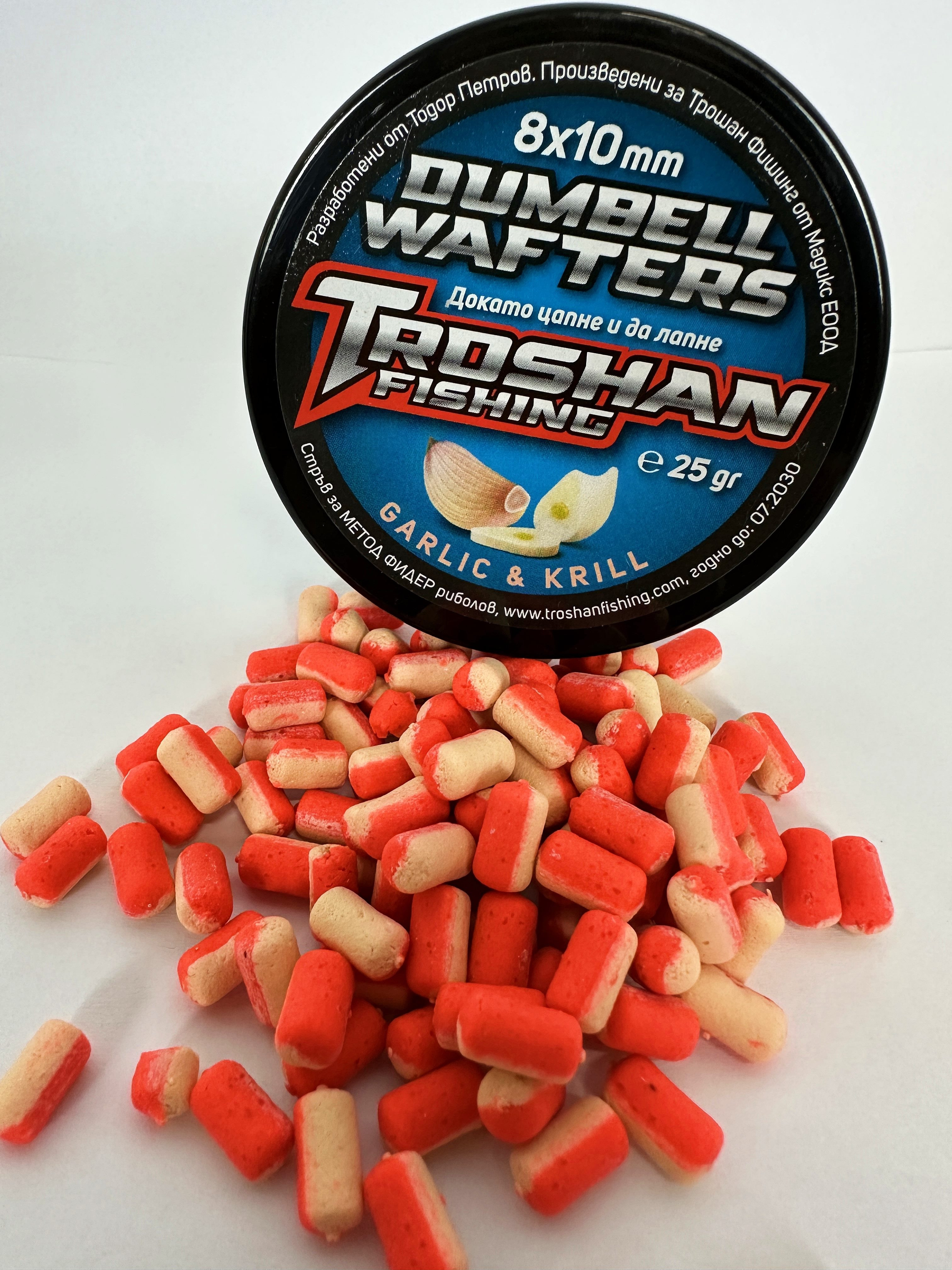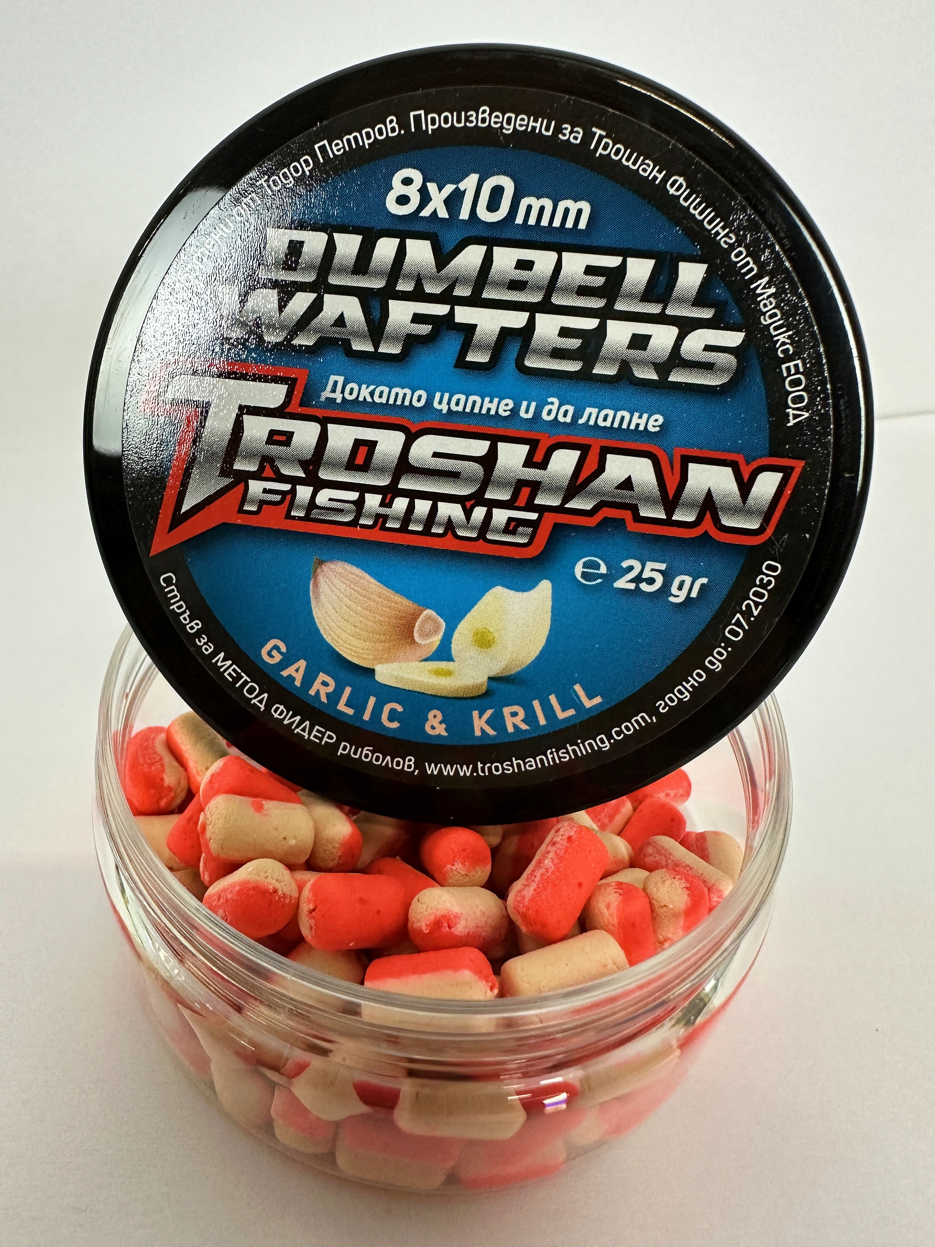 Dumbell Wafters Troshan Fishing - Garlic & Krill 8х10mm са висококачествени вафтери, създадени специално за любителите на фидер и шаранджийски риболов. Комбинацията от аромат на чесън и крил прави тези вафтъри изключително атрактивни за рибите, като стимулира апетита им дори при по-слаба активност. Стабилната им плаваемост и форма тип „dumbell“ ги правят предпочитан избор при състезателен и любителски риболов.