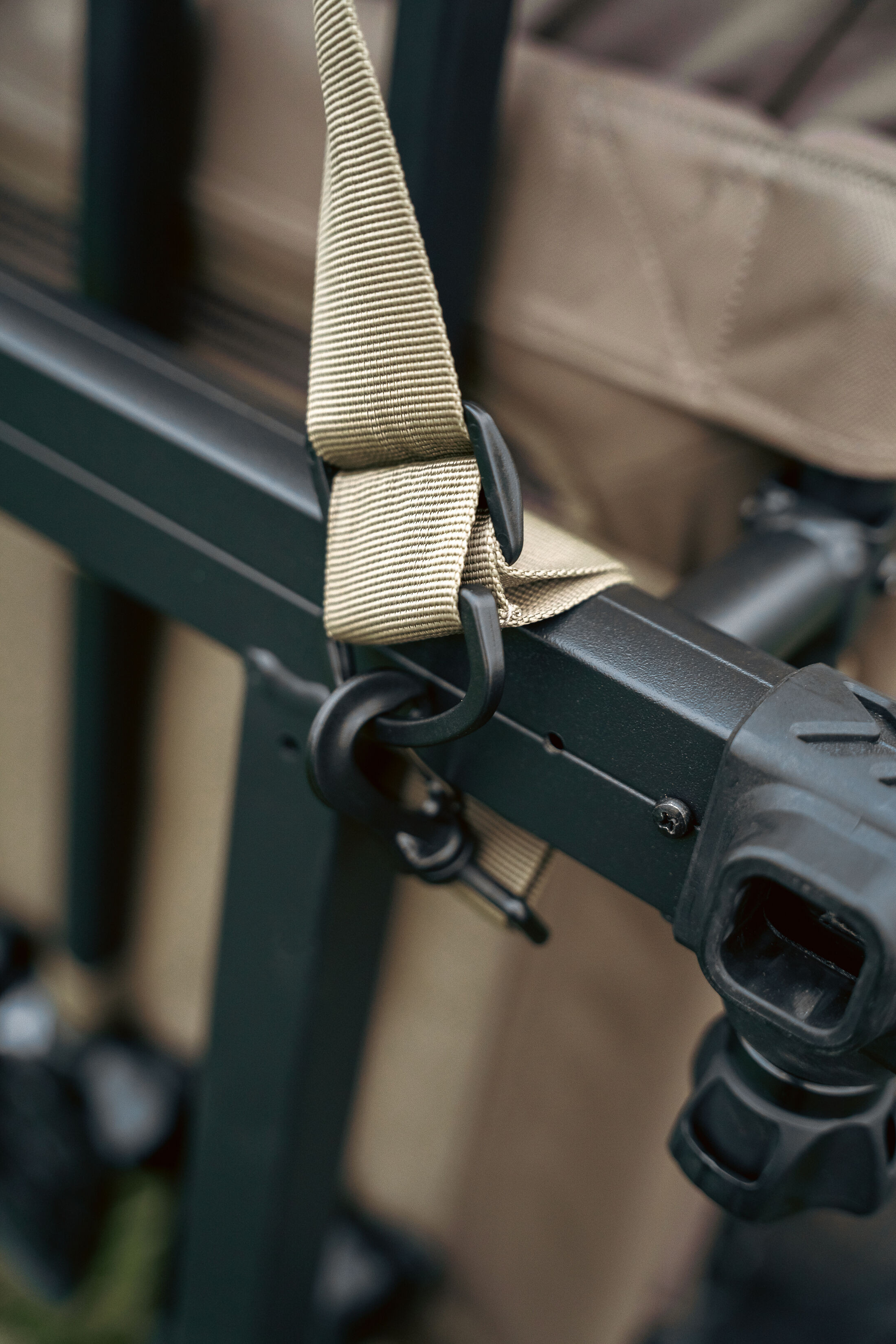 При транспортиране столът също е замислен с внимание към детайла – краката се закрепват с еластични примки, което елиминира неприятното разместване, а включената регулируема подплатена презрамка за носене прави пренасянето лесно и удобно дори при по-дълги разстояния. Телескопичните крака с пружинен механизъм позволяват бързо адаптиране към различен релеф, така че винаги да седите стабилно и на желаната височина.