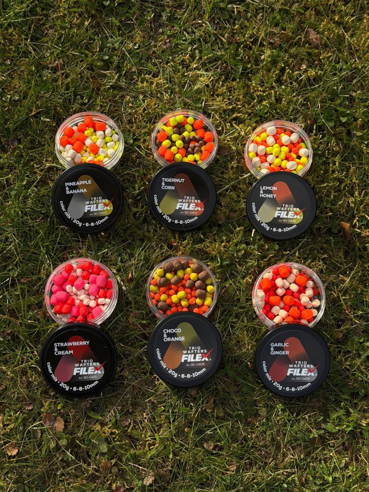 Представяме ви Filex TRIO WAFTERS 6-8-10мм – иновационна серия примамки тип „уафтър“, проектирани да осигурят перфектно представяне във водата. Тези уникални топчета с форма на дъмбел са идеални за шаранджийски риболов, фидер риболов и дори за състезателни условия. Със своите три различни размера – 6мм, 8мм и 10мм – и разнообразие от флуоресцентни цветове, те предлагат гъвкавост и ефективност, независимо от условията на риболов. Изработени от висококачествени съставки, тези уафтери остават меки и атрактивни за дълго време, което ги прави идеални за бързо и лесно монтиране на куки и щифтове.