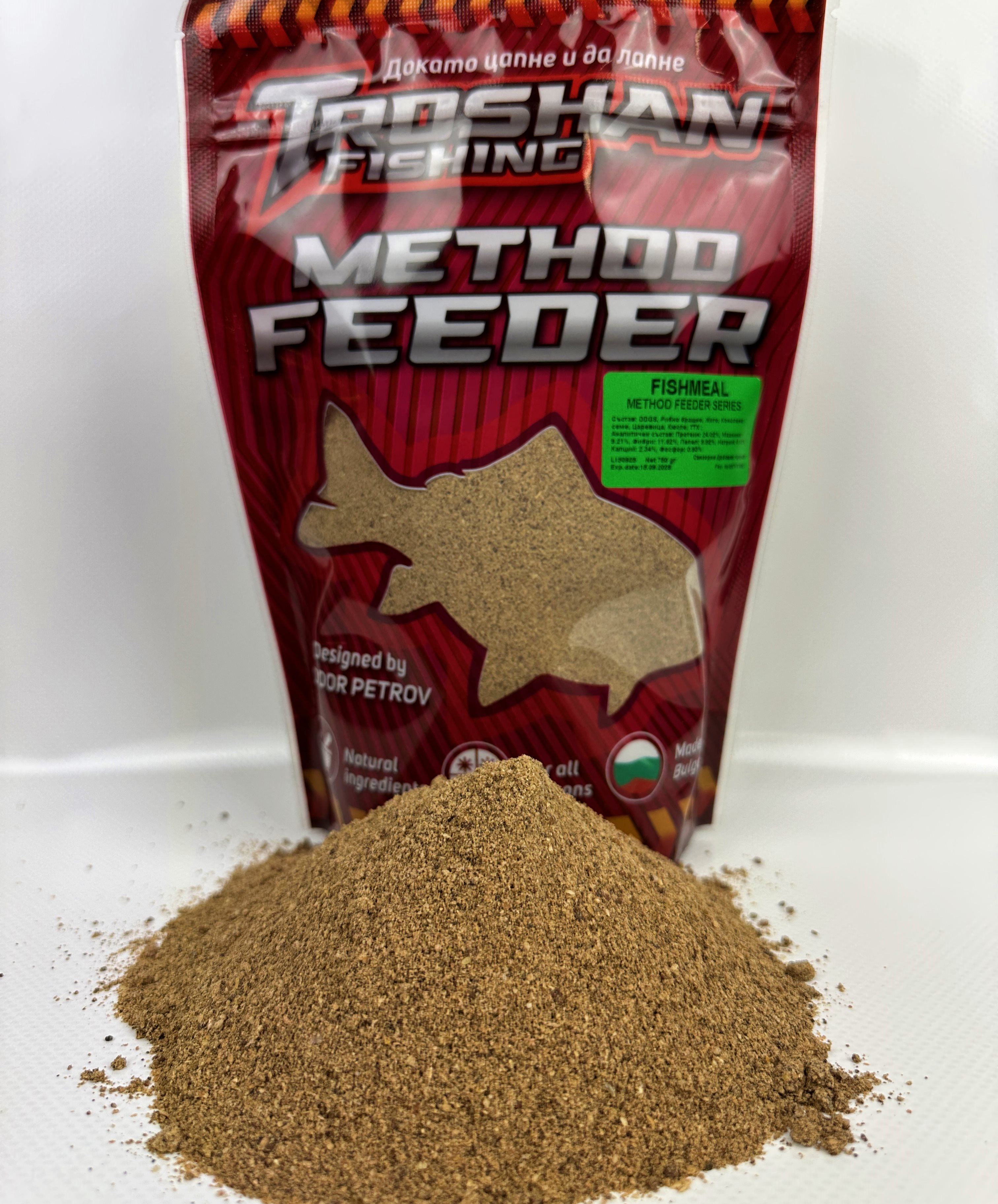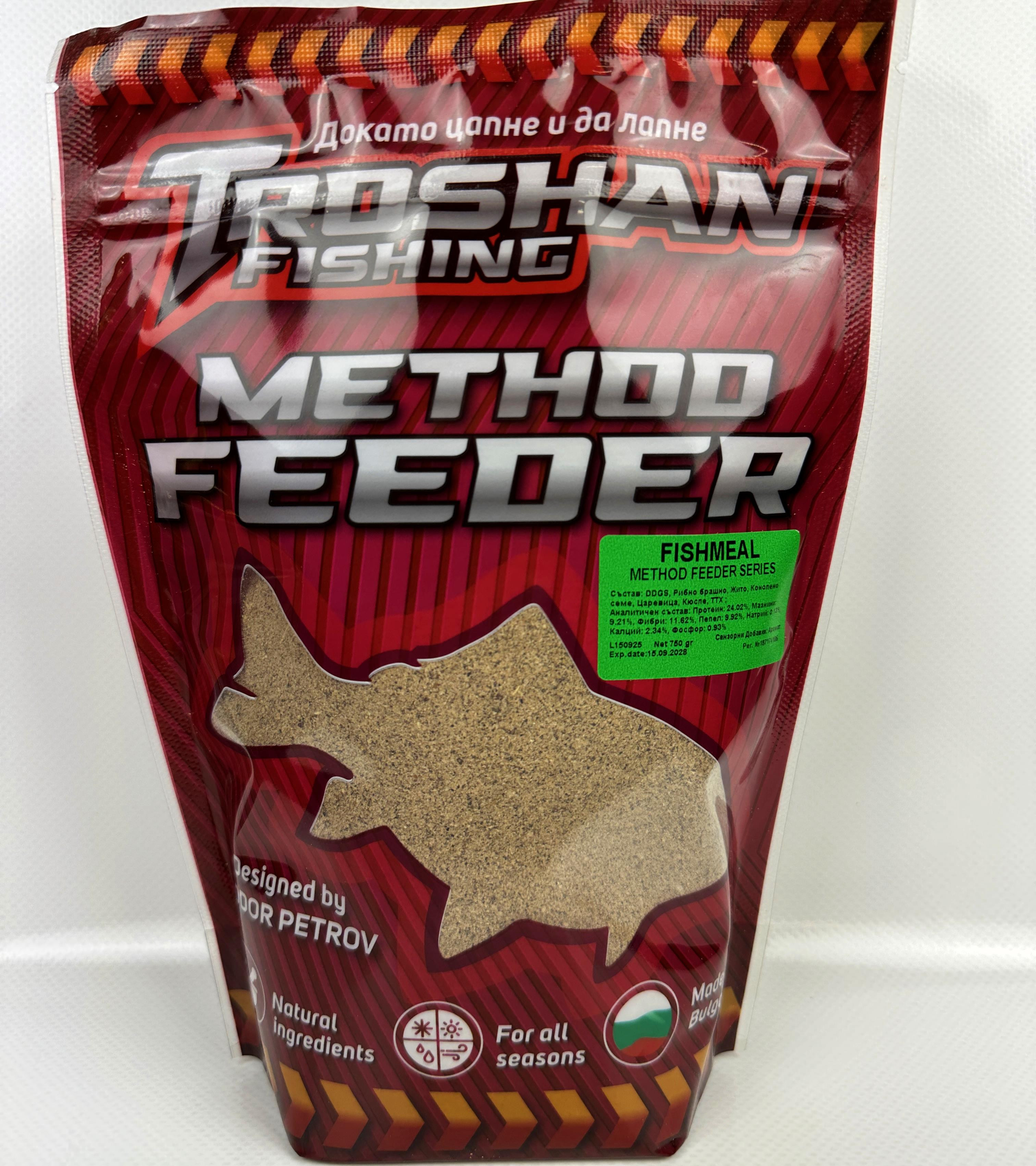 Method Feeder Захранка Troshan Fishing - Fishmeal 750гр е висококачествена захранка, специално разработена за успешен риболов на различни видове риба, като шаран, каракуда, амур и други. Благодарение на съдържанието на рибно брашно (fishmeal), този продукт притежава силно привлекателен аромат и хранителна стойност, които стимулират апетита на рибата и увеличават шансовете за улов. Подходяща е както за начинаещи, така и за опитни риболовци, които търсят надеждни риболовни принадлежности за своя арсенал.