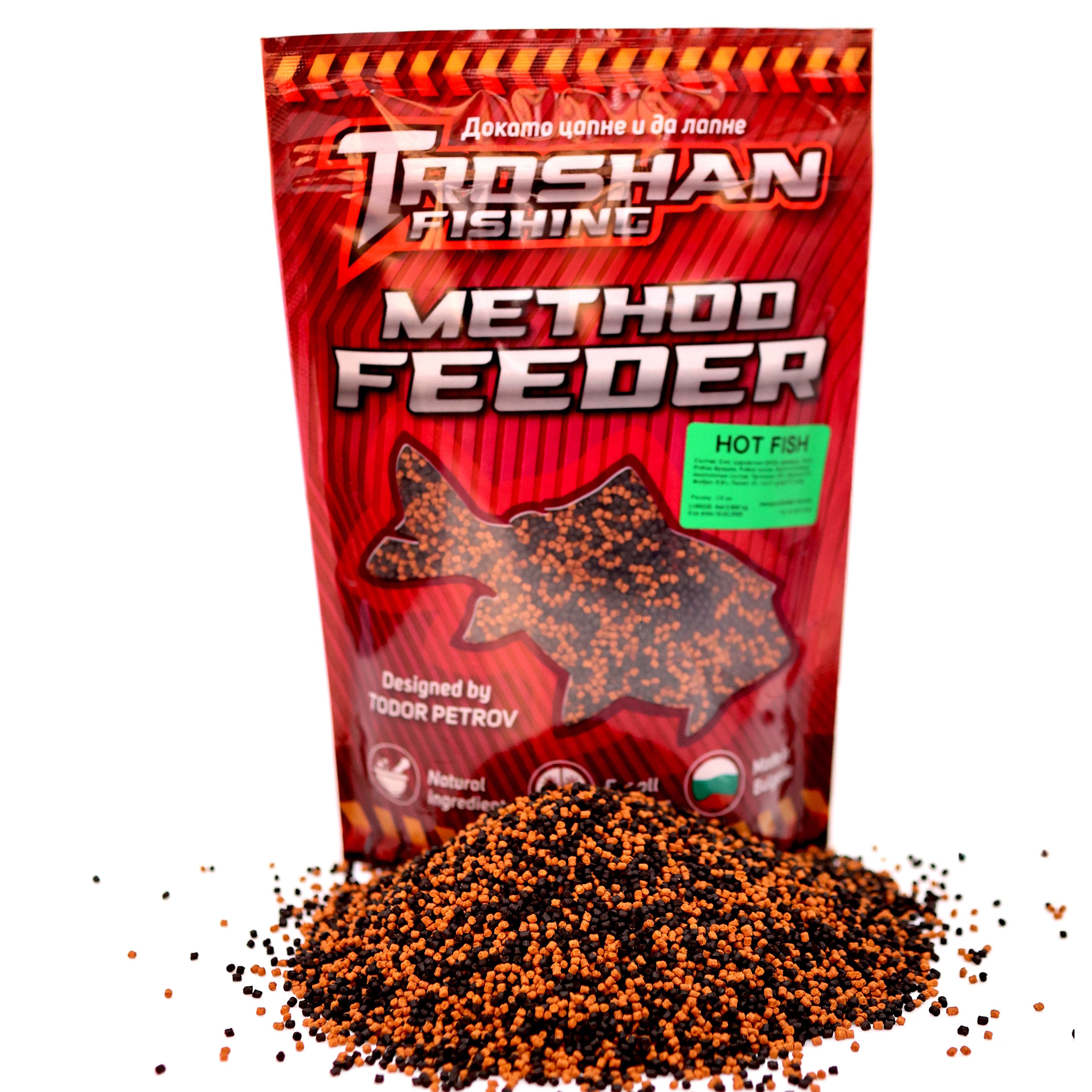 Method Feeder Пелети Troshan Fishing - Hot Fish 2mm са специално разработени за всеки страстен риболовец, който търси ефективен и лесен начин за привличане на риба. Тези пелети се отличават с интензивен аромат на люта риба и текстура, която гарантира бързо разпадане във водата, осигурявайки максимален интерес от страна на рибата. Те са идеални за използване с метод фидер хранилка, която позволява прецизно подаване на стръвта до желаното място.