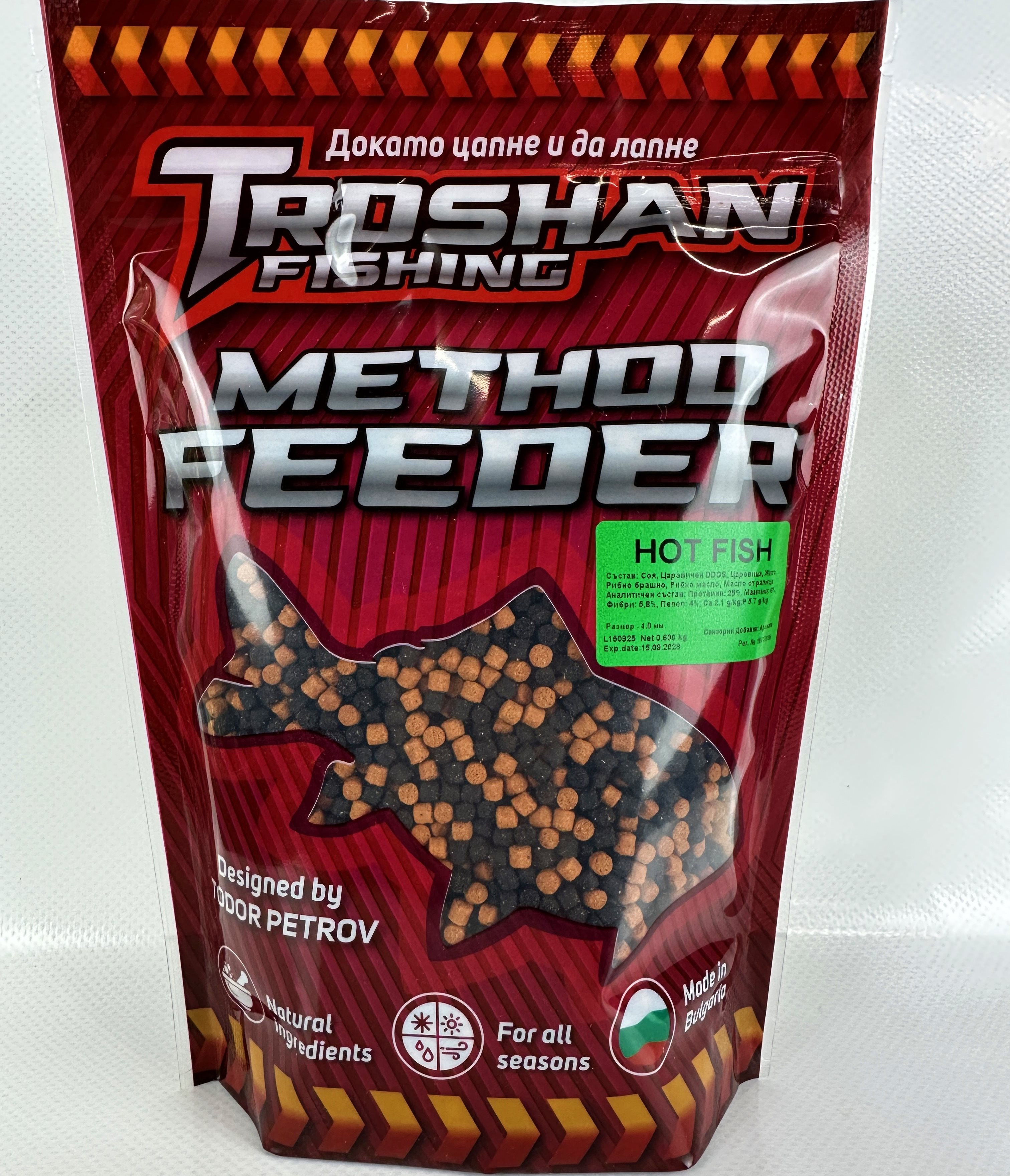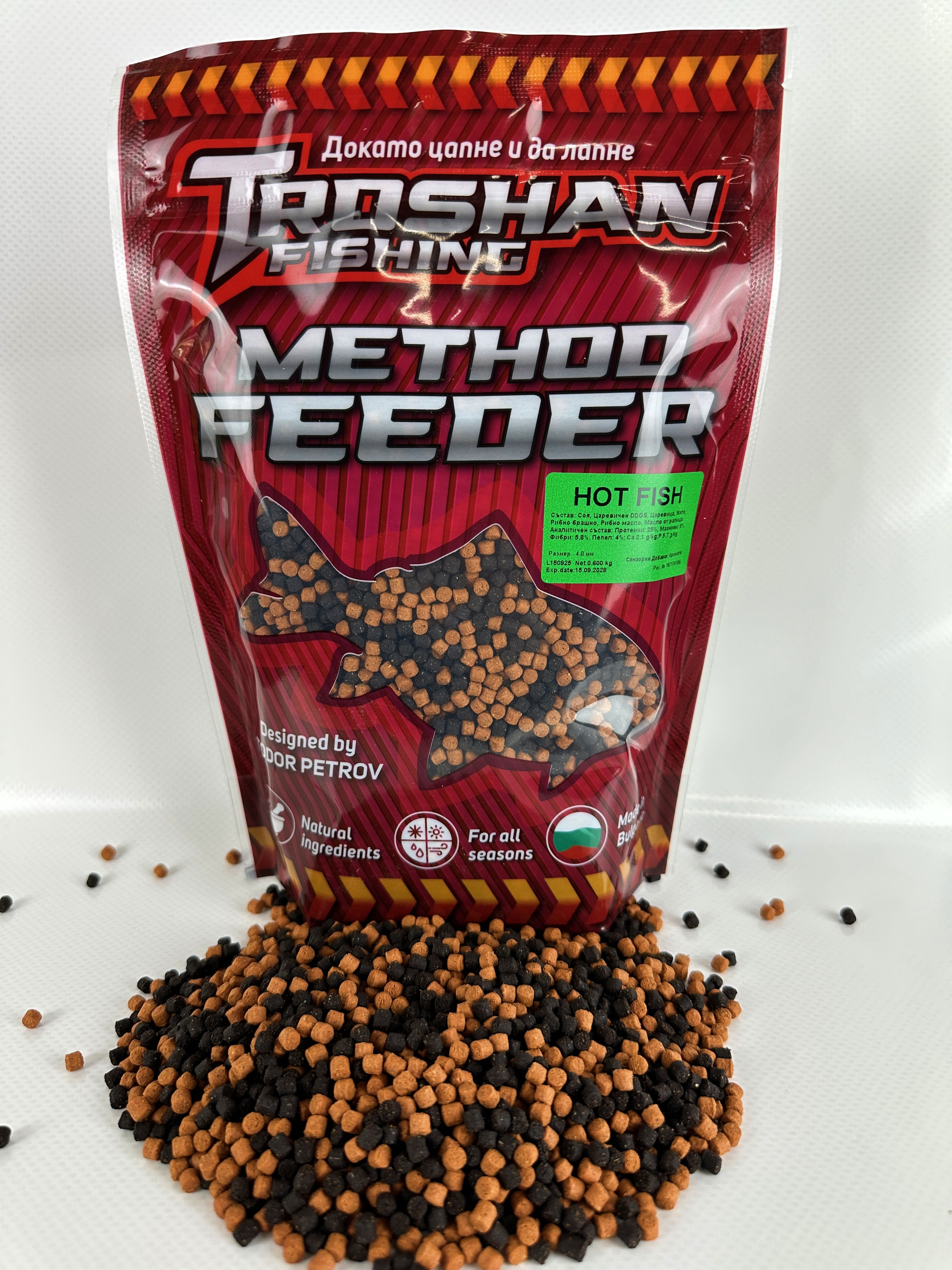 Method Feeder Пелети Troshan Fishing - Hot Fish 4mm са специално разработени за всеки страстен риболовец, който търси ефективен и лесен начин за привличане на риба. Тези пелети се отличават с интензивен аромат на люта риба и текстура, която гарантира бързо разпадане във водата, осигурявайки максимален интерес от страна на рибата. Те са идеални за използване с метод фидер хранилка, която позволява прецизно подаване на стръвта до желаното място.