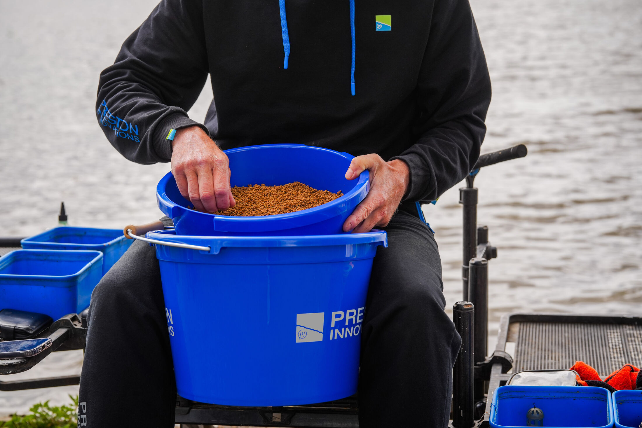 Легенът е подходящ за подхранка или за накисване и разбъркване на пелети, малкият му обем позволява да бъде поставен на страничната маса, а съхранението му в кофата ще ви спести допълнително място и ще направи комплекта много компактен.