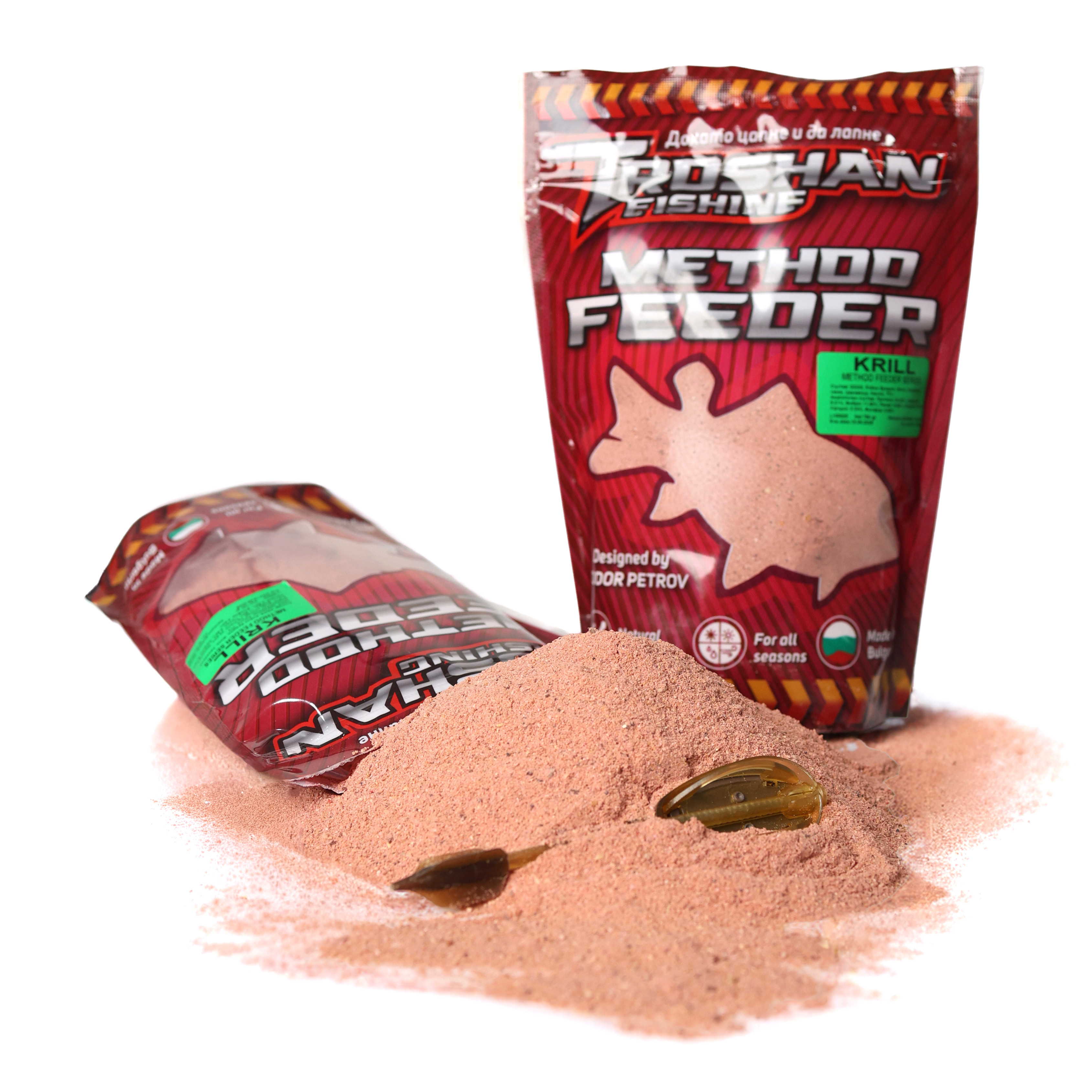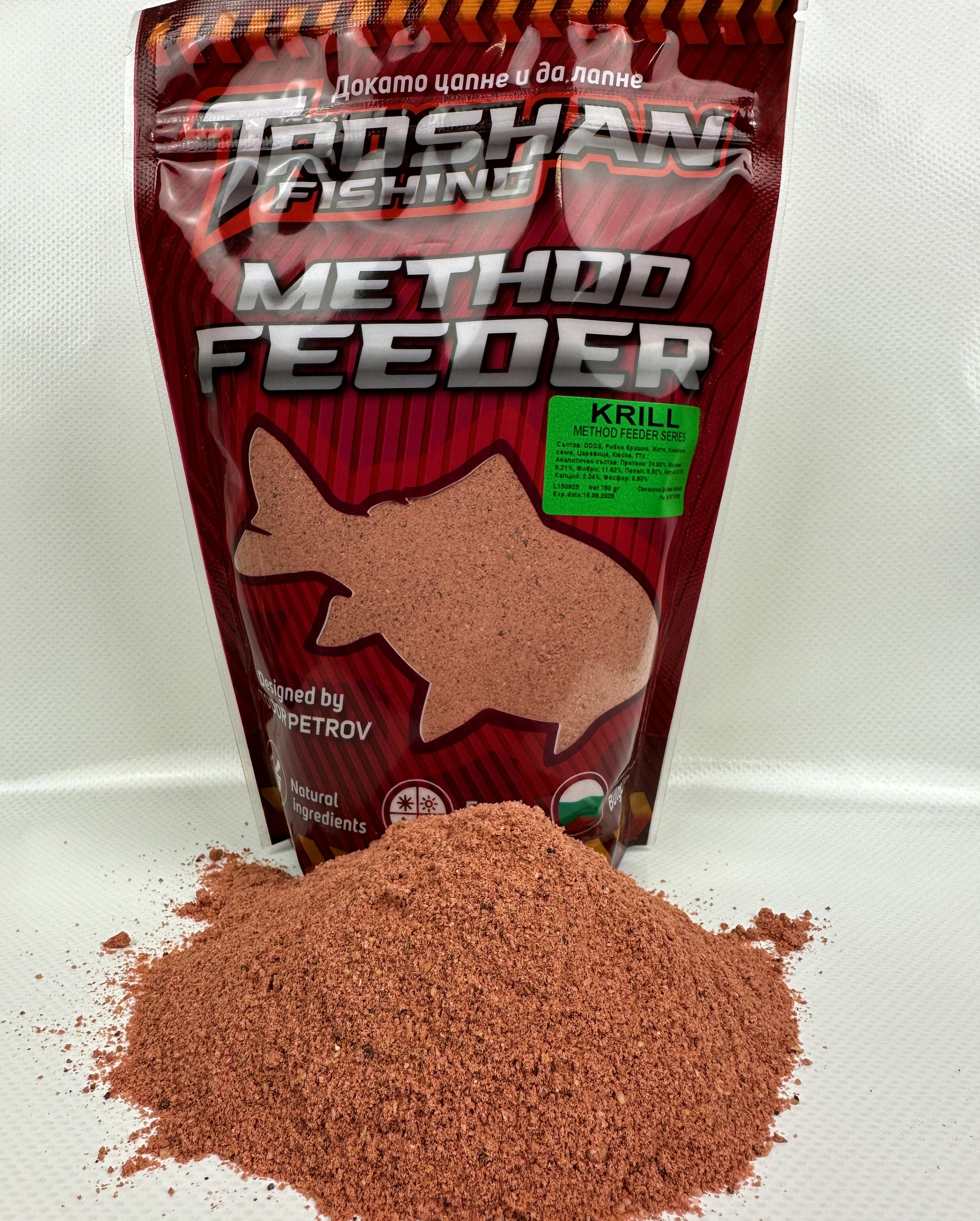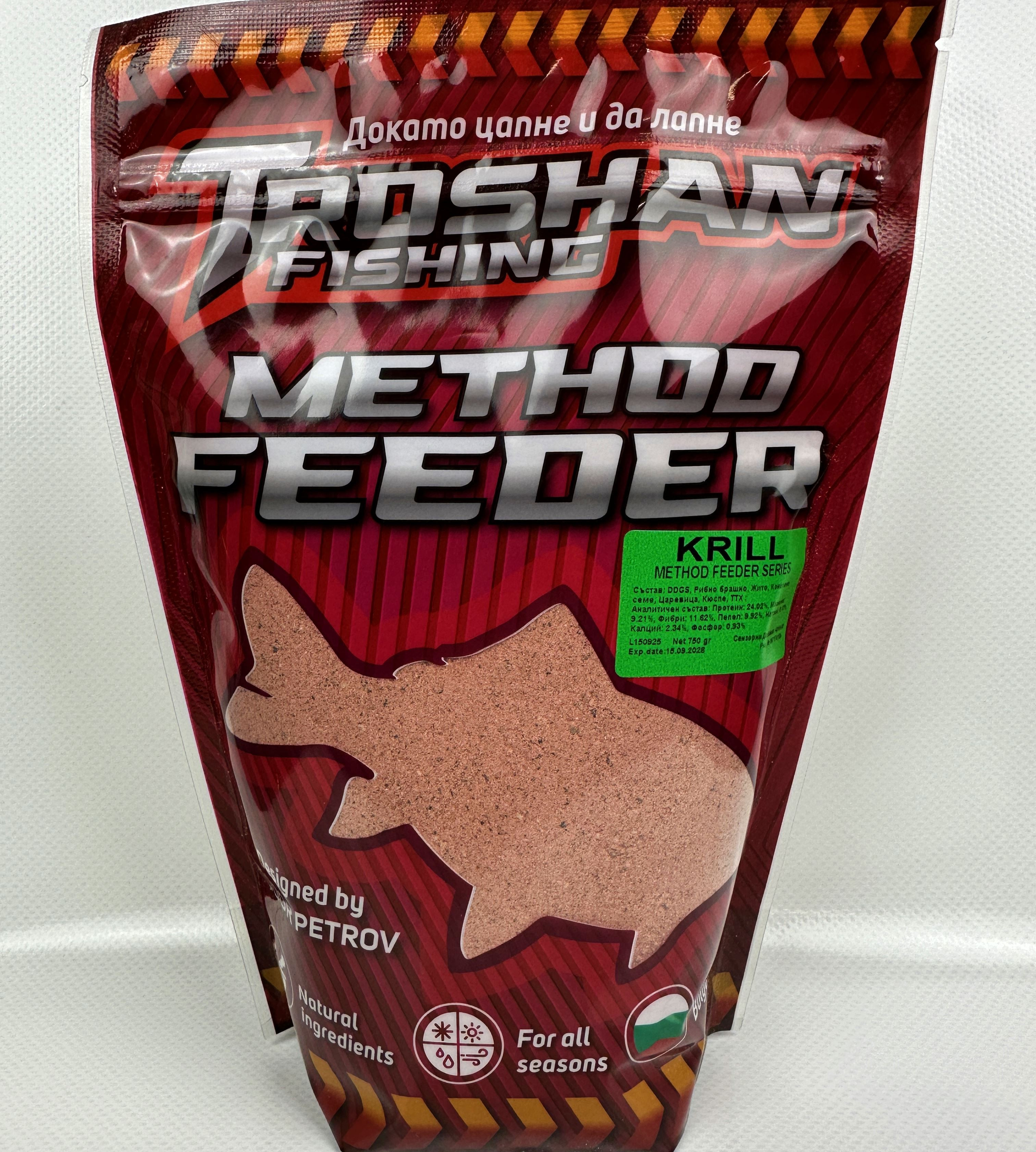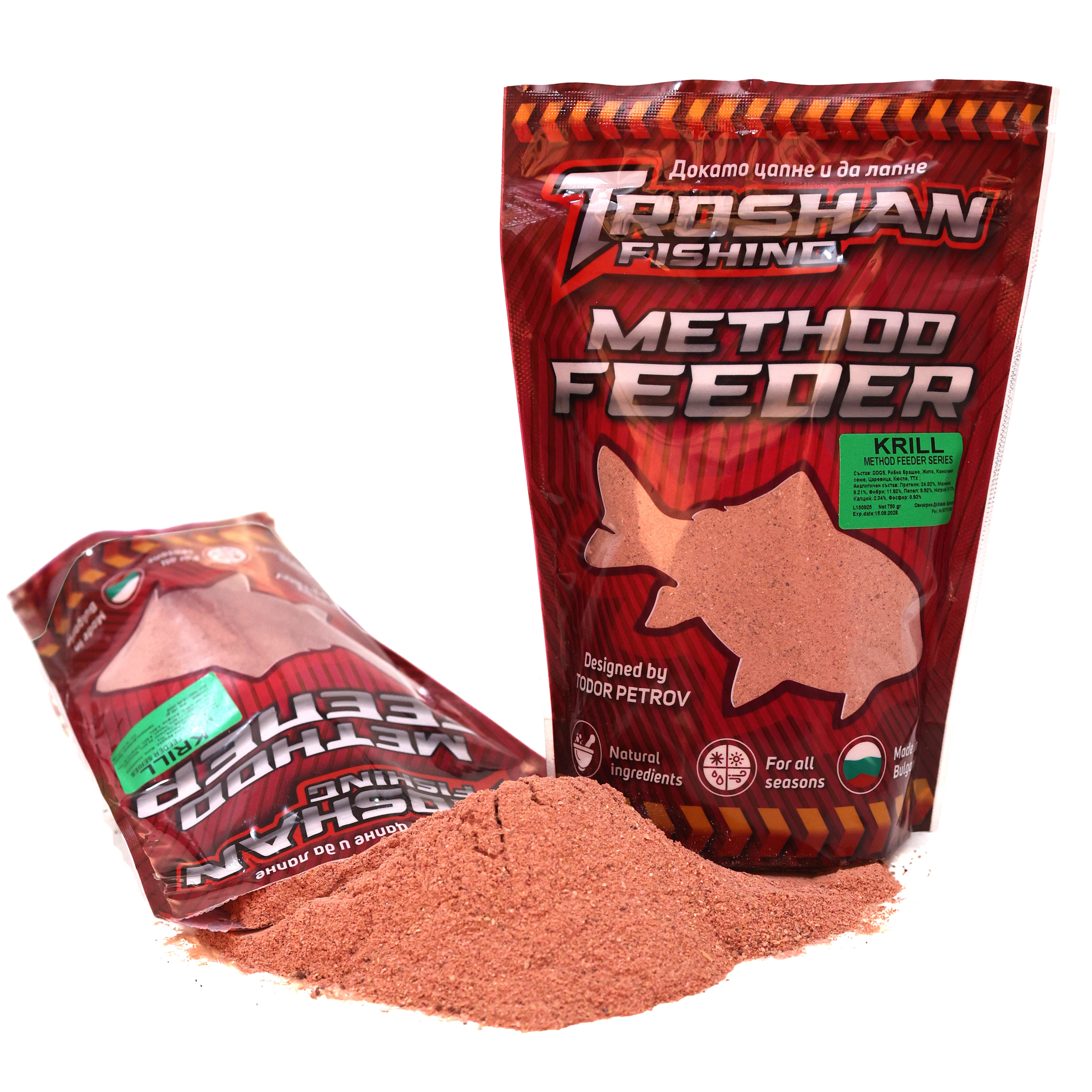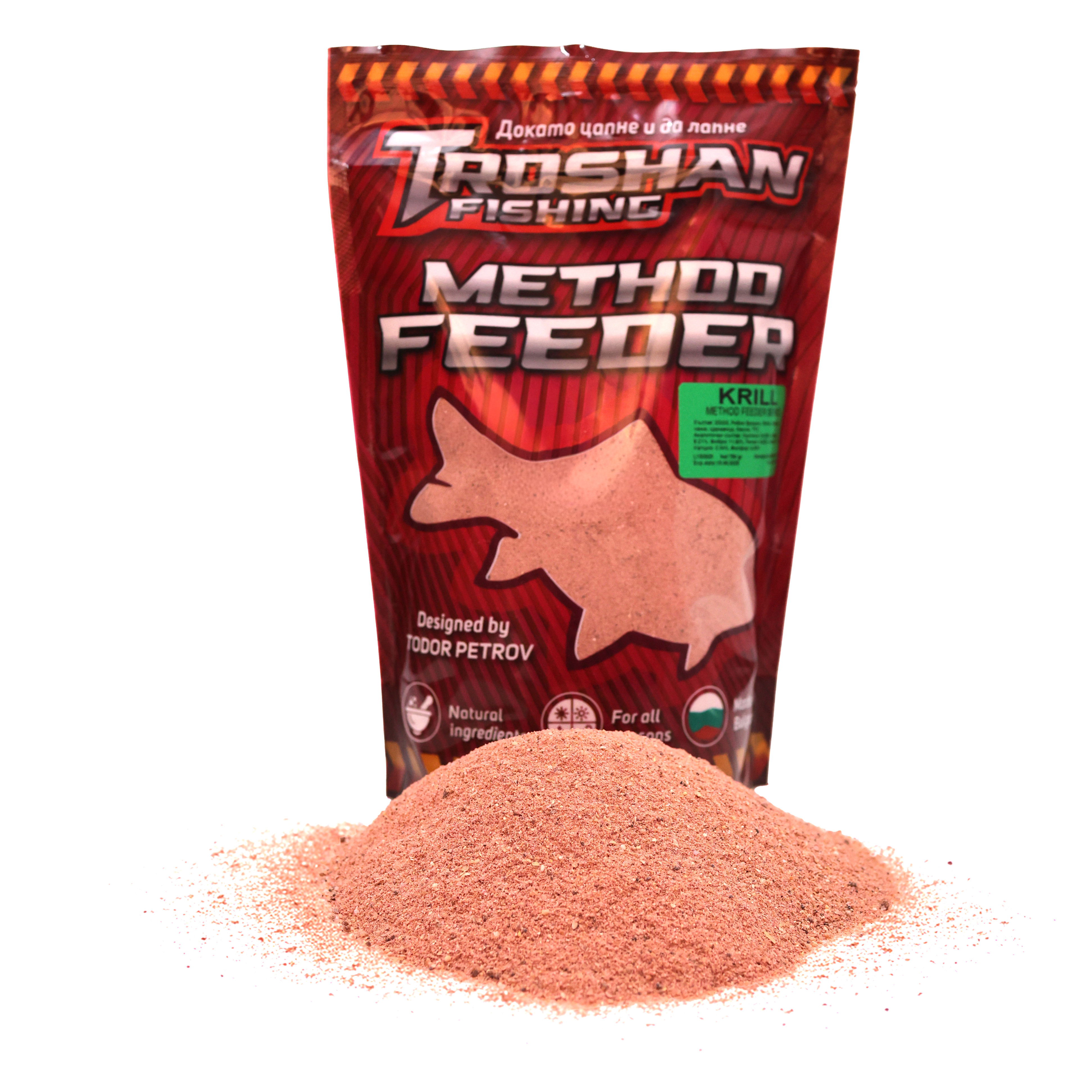 Method Feeder Захранка Troshan Fishing - Krill 750гр е специално разработена за любителите на спортния и любителския риболов, които търсят надеждна и ефективна примамка. Със своя богат аромат на крил, този продукт е изключително подходящ за привличане на шарани, амури, каракуди и други мирни риби, като същевременно предлага високо качество и отлични резултати във всякакви водоеми.