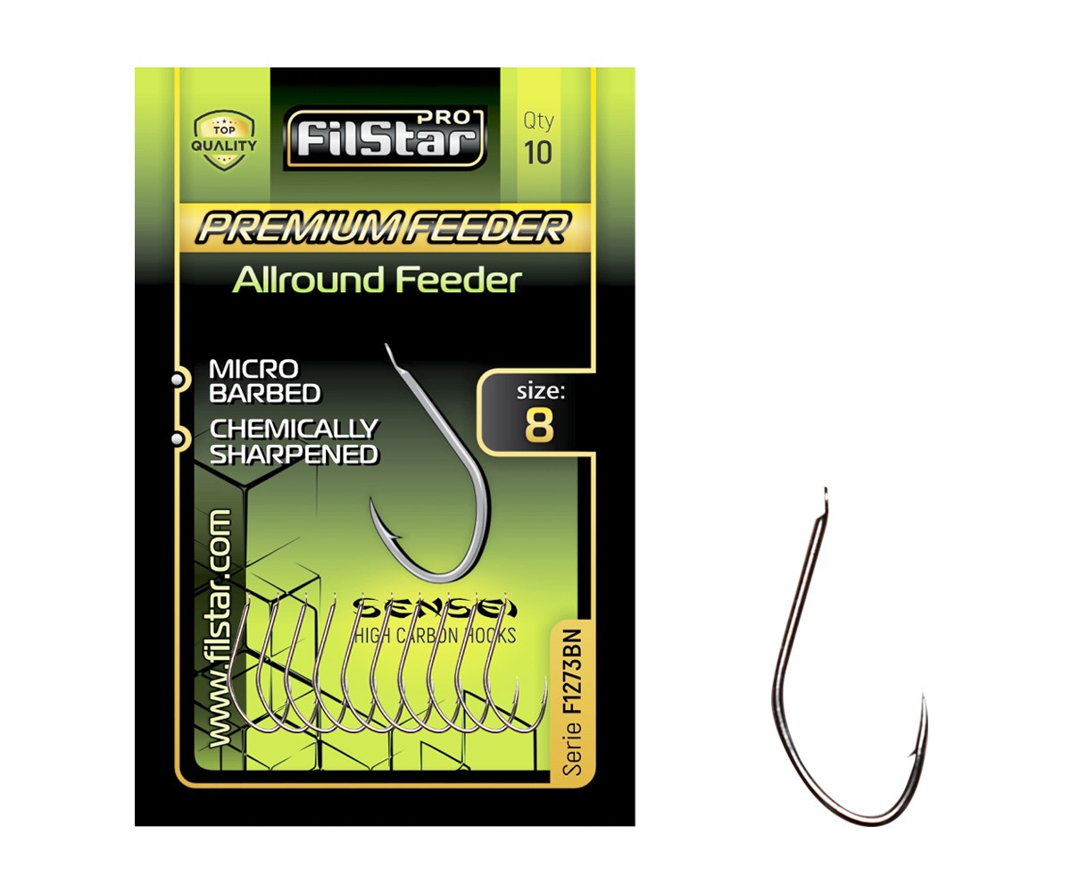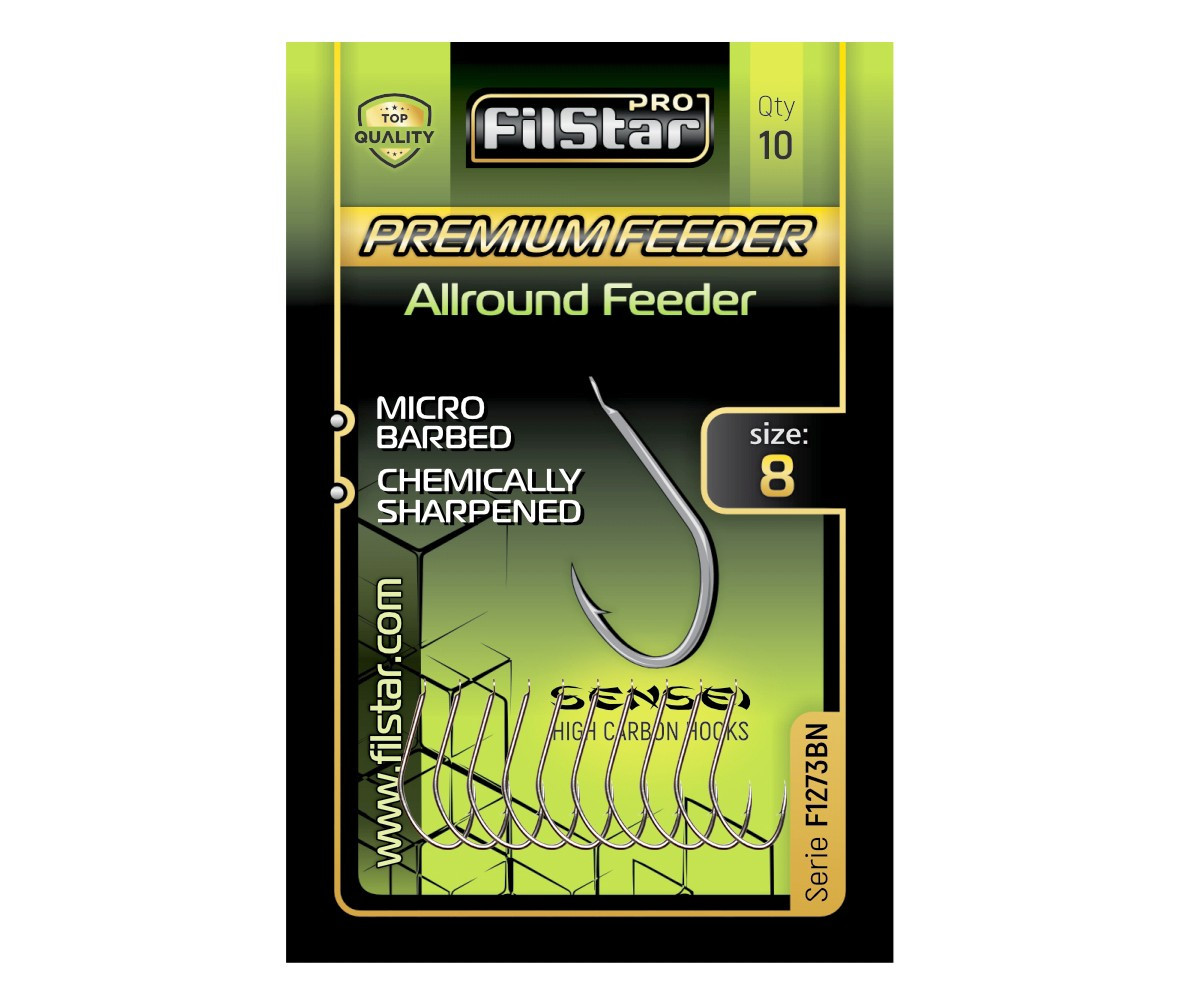 Висококачествени куки F1273BN от серията Filstar Premium Feeder, които са изработени от въглеродна стомана и имат химически заточени остриета.