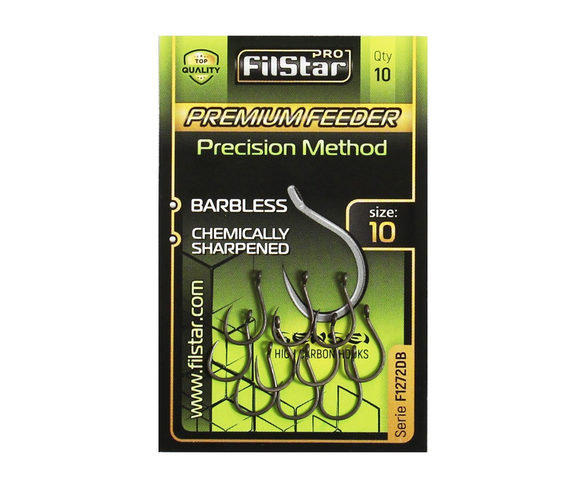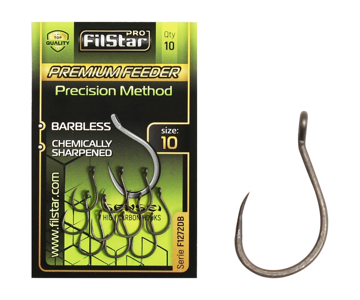 Висококачествени куки F1272DB от серията Filstar Premium Feeder, които са изработени от въглеродна стомана и имат химически заточени остриета.
