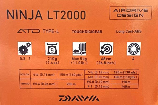 Daiwa ’23 Ninja LT съчетава последните японски концепции за дизайн на макари при изключително съотношение цена-качество! В сравнение с предишния модел, Daiwa ’23 Ninja e подобрена значително. Благодарение на влагането в механизна на новия Airdrive ротор, теглото на макарата в предната й част е намалено, като това оказва влияние на баланса между въдицата и макарата. С по-балансиран такъм, риболовецът има възможност за мигновени реакции, колкото и продължителен да е излета. Прецизната и изключително здрава предавка Tough Digigear се грижи за копринено гладкия ход на макарата. Новият Airdrive бигел е по-лек от предходните модели, като същевремено е по-здрав и по-устойчив и предотвратява евентуални усуквания по основното влакно, било то монофилно или плетено. Авансовата система ATD L-type е супер прецизна и стартира без никакво съпротивление, адекватно на всяка една риболовна ситуация. Специфичният дизайн на алуминиевата ABS шпула спомага за постигането на по-далечни кастингови дистанции, а водещата ролка при бигела от поколение Twist Buster III не пресуква и не наранява дори плетени влакна. Daiwa ’23 Ninja LT е страхотно решение за всеки един риболовец, който не иска покупката на такъми да се отрази на джоба му.