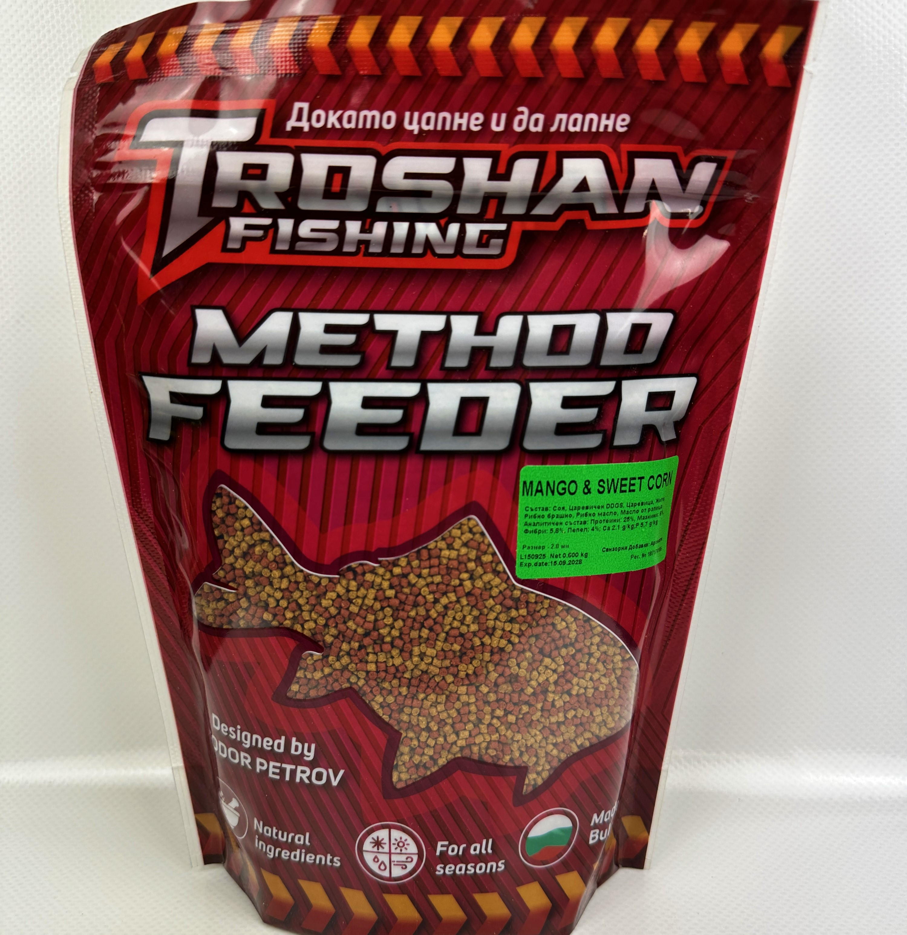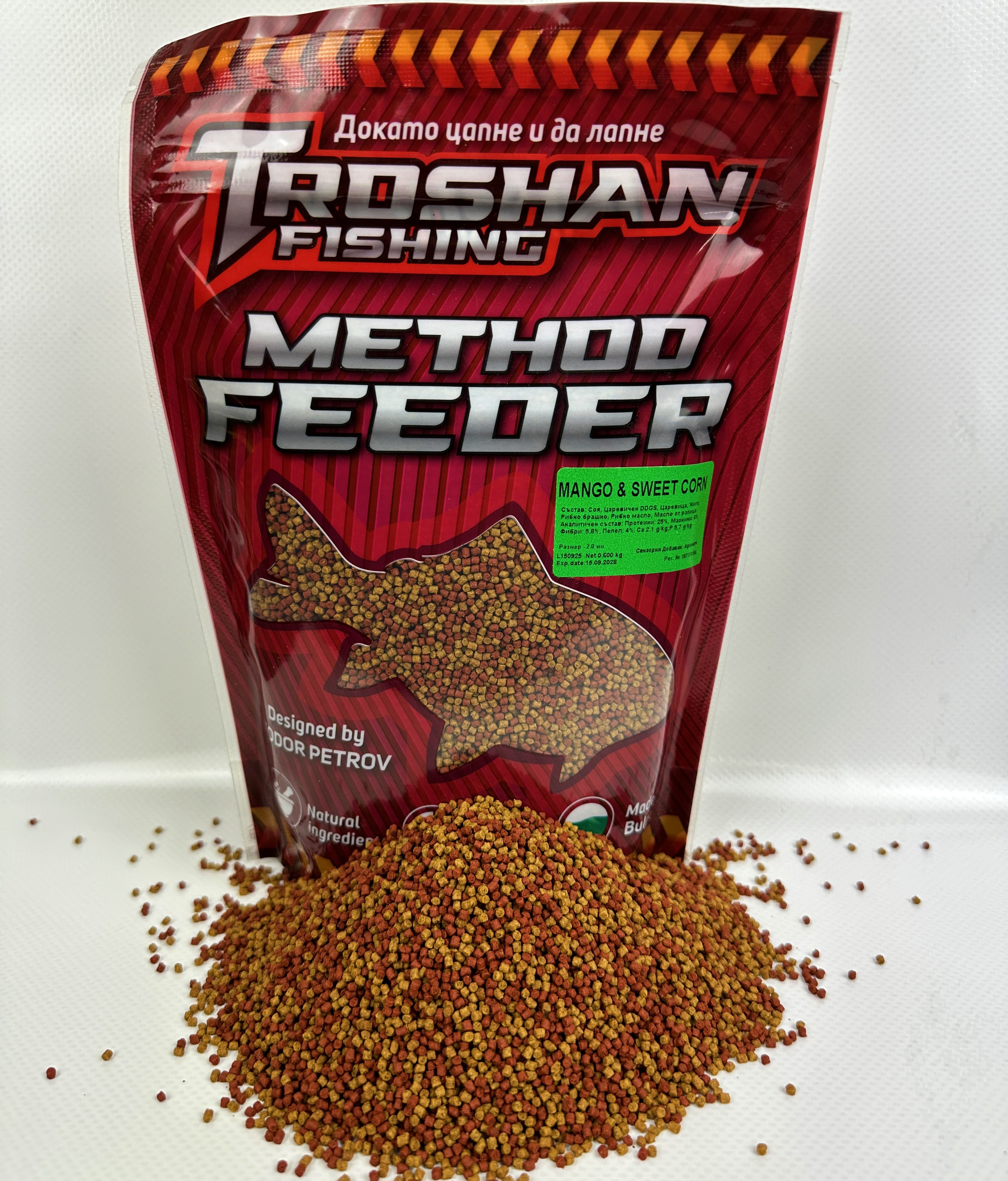 Method Feeder Пелети Troshan Fishing - Mango & Sweet Corn 2mm са перфектният избор за всеки риболовец, който иска да увеличи улова си. Тези пелети за риболов са специално създадени за метод фидер риболов, като съчетават атрактивен аромат на манго и сладка царевица, който привлича рибата бързо и ефективно. С тях ще се насладите на по-успешни и удовлетворяващи риболовни сесии.
