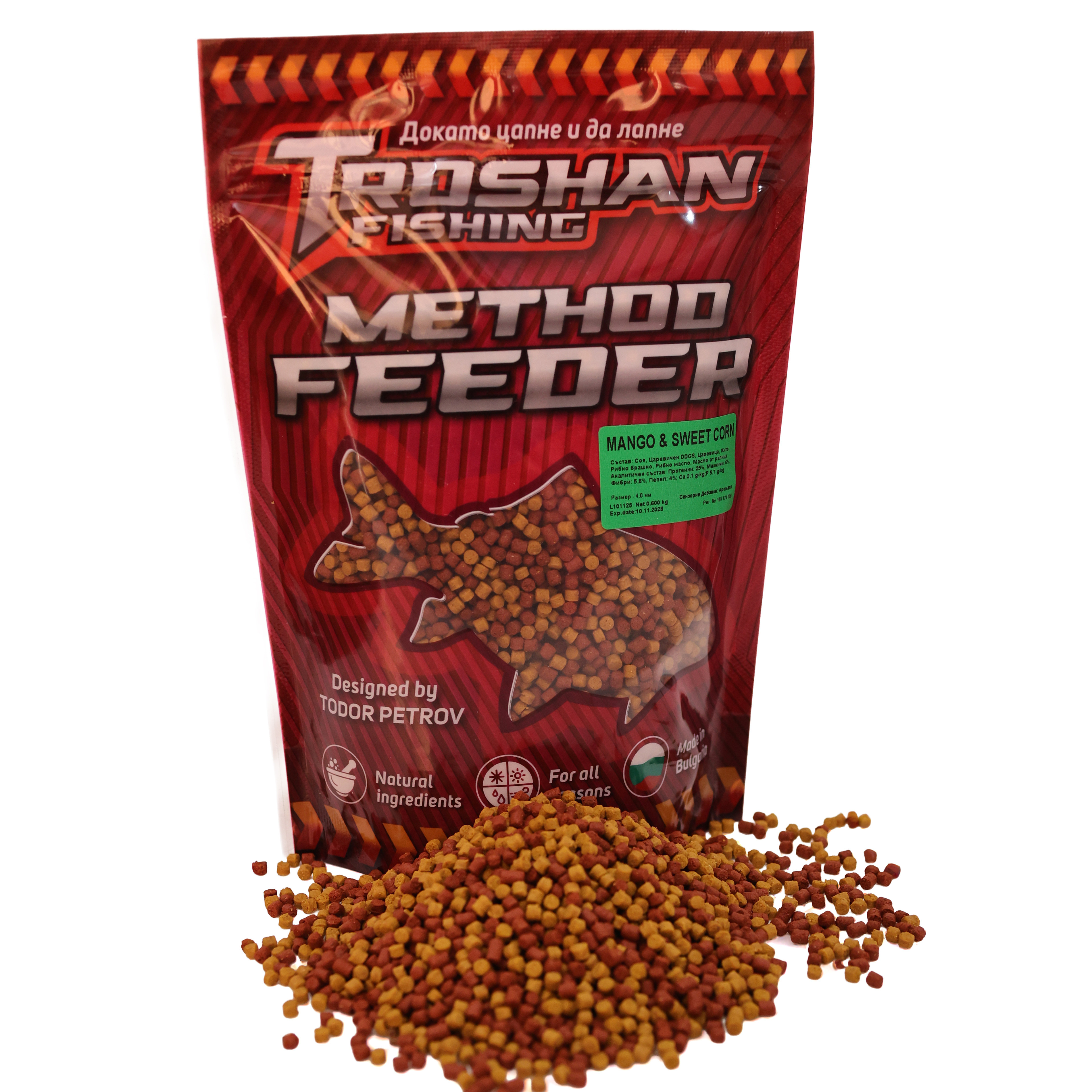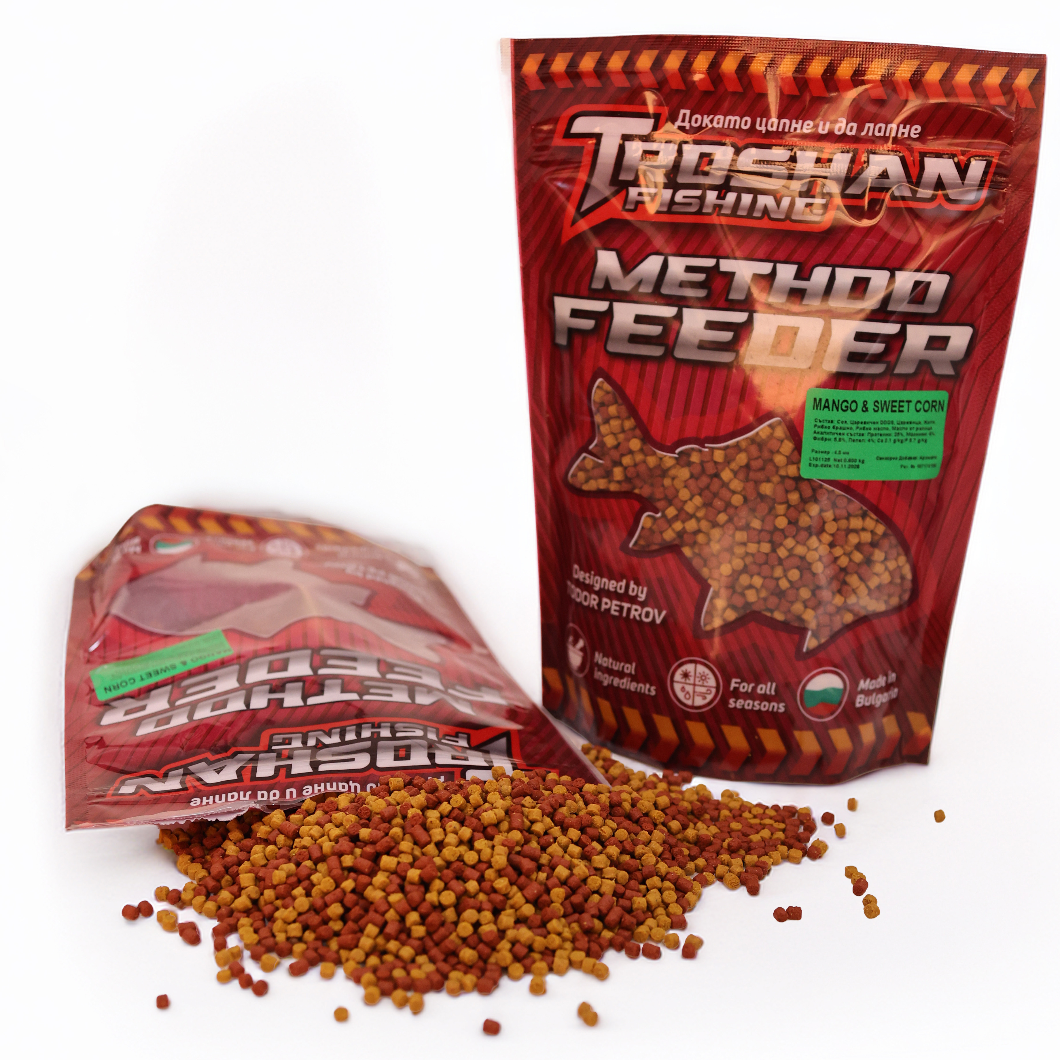 Method Feeder Пелети Troshan Fishing - Mango & Sweet Corn 4mm са перфектният избор за всеки риболовец, който иска да увеличи улова си. Тези пелети за риболов са специално създадени за метод фидер риболов, като съчетават атрактивен аромат на манго и сладка царевица, който привлича рибата бързо и ефективно. С тях ще се насладите на по-успешни и удовлетворяващи риболовни сесии.