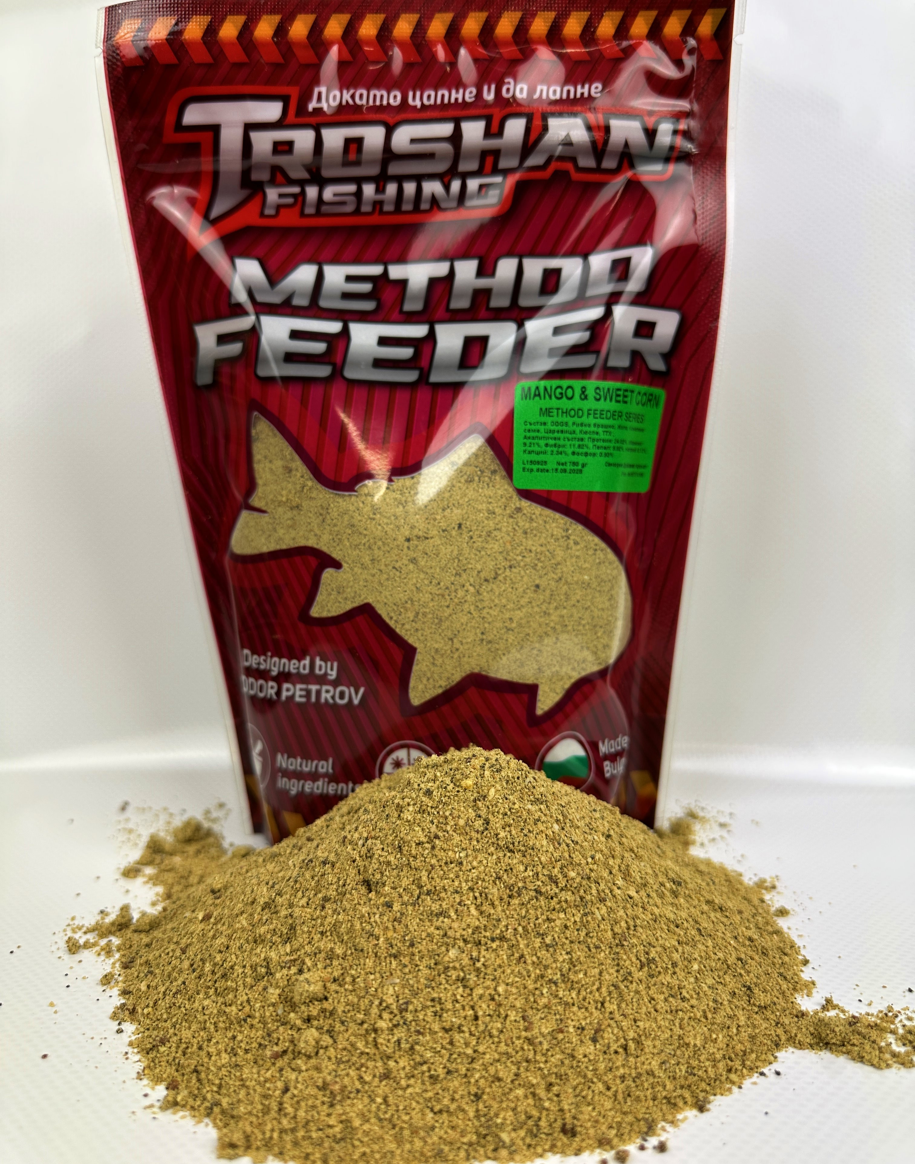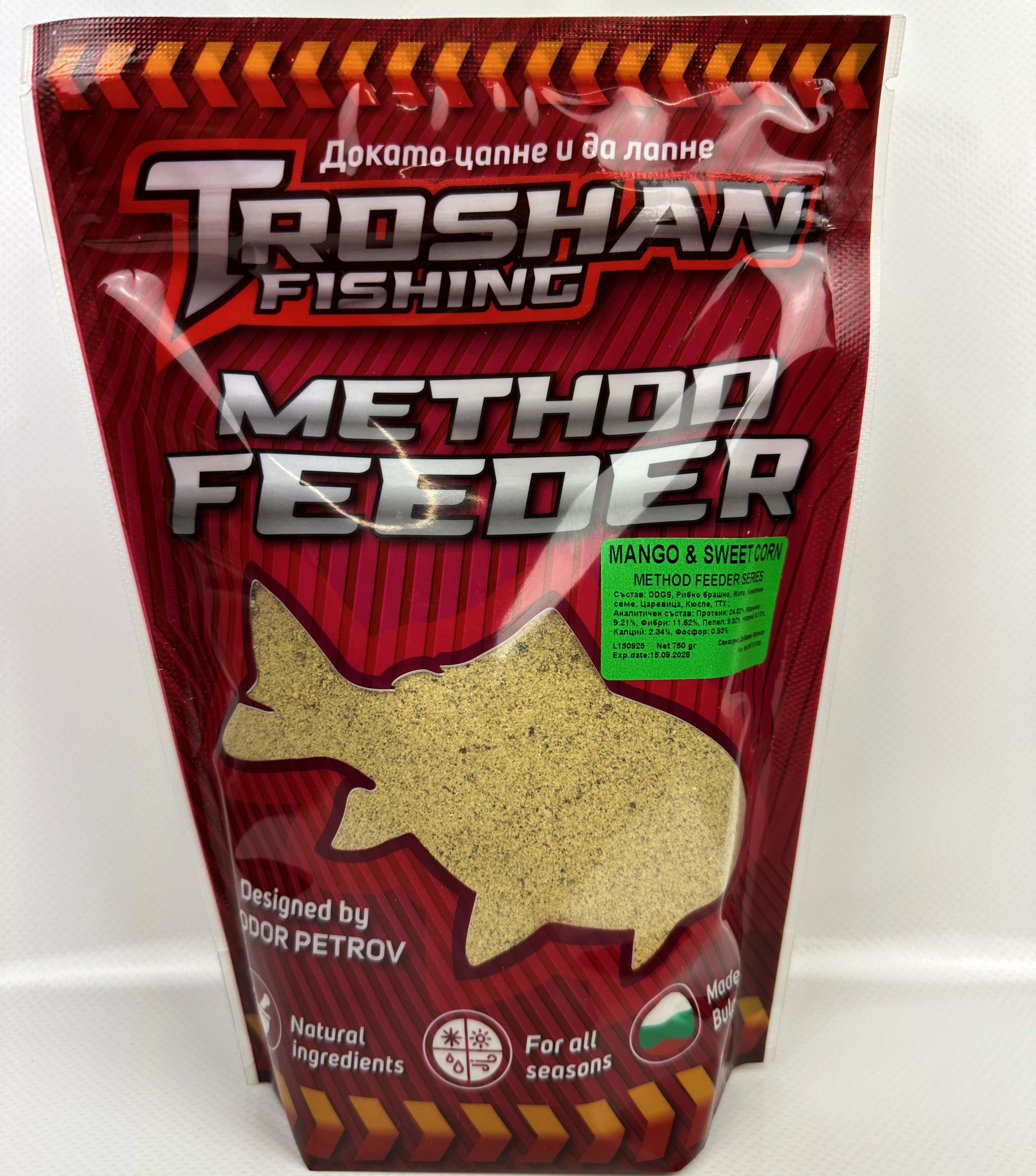 Ако обичате риболова с Method Feeder монтажи, тогава Troshan Fishing Mango & Sweet Corn 750гр е перфектният избор за вас. Захранката е създадена за успешен риболов на шарани,каракуди, амури и други мирни риби, като съчетава сладкия аромат на манго и сладка царевица – комбинация, която доказано привлича рибата бързо и ефективно.