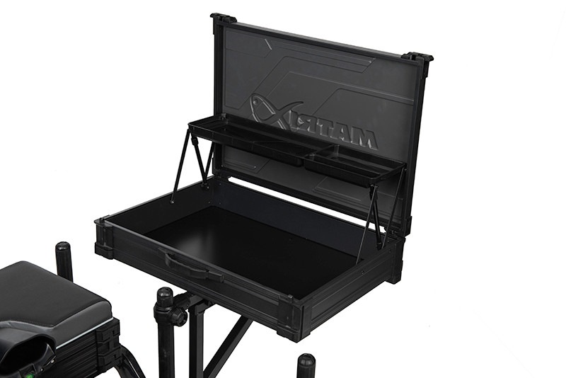 Една от най-популярните странични маси на МATRIX, вече е по-добра ! MATRIX Pro Rigid Feeder Tray се инсталира много бързо, вече няма допълнителни крака. Масата се подсигурява от здрава упора която се фиксира много лесно на носещият крак. Основата е твърда, а капака е от здрав ABS материал. Разбира се имате на разположение и стандартния рафт на който да поставите своите най-необходими принадлежности. Пантите позволяват капака да стои във всяка позиция която ви е необходима. Същевременно можете да го затворите или отворите само с едно движение на ръката. За да е лесен транспорта имате на разположение удобна дръжка. На дръжката е много удобно да поставите кърпа. Без проблем можете да оставите цялото оборудване в масата и да я транспортирате така, без значение дали то е върху рафта или в основното отделение.