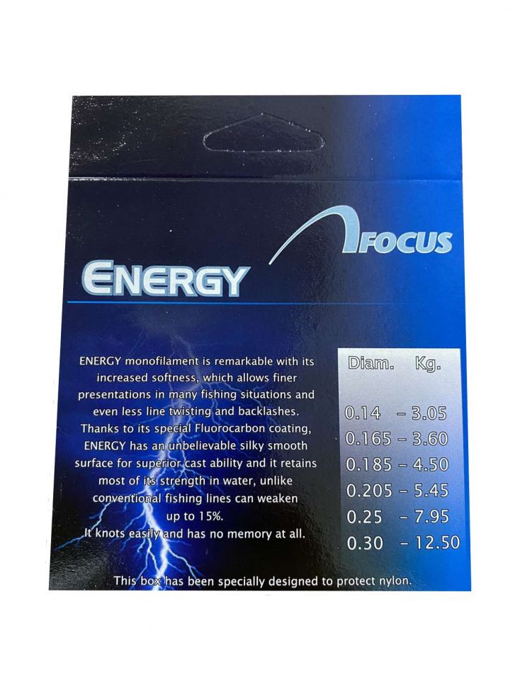 Благодарение на своето флуорокарбоново покритие Energy притежава невероятна копринено гладка повърхност за изключителна способност на изхвърляне и за запазване на по-голяма част от здравината му във водата, за разлика от конвенционалните влакна, които отслабват с повече от 15%. Връзва се лесно и няма памет.
