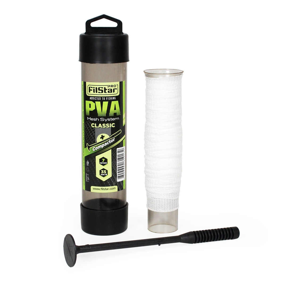 Ръкавът e с дължина 7 m и е нанизан около тръба с фуниест отвор в единия край, които улесняват зареждането на захранката. Иструментът за уплътняване ви помага да създадете перфектните компактни опаковки със стръв. Класически PVA комплект, съдържащ всичко необходимо, поместено в малък твърд тубус.