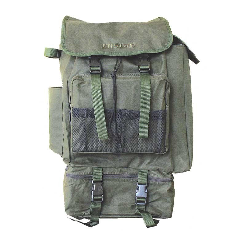 Многокамерна раница за транспортиране на рибарски принадлежности изработена от дебел и устойчив водонепроницаем плат.