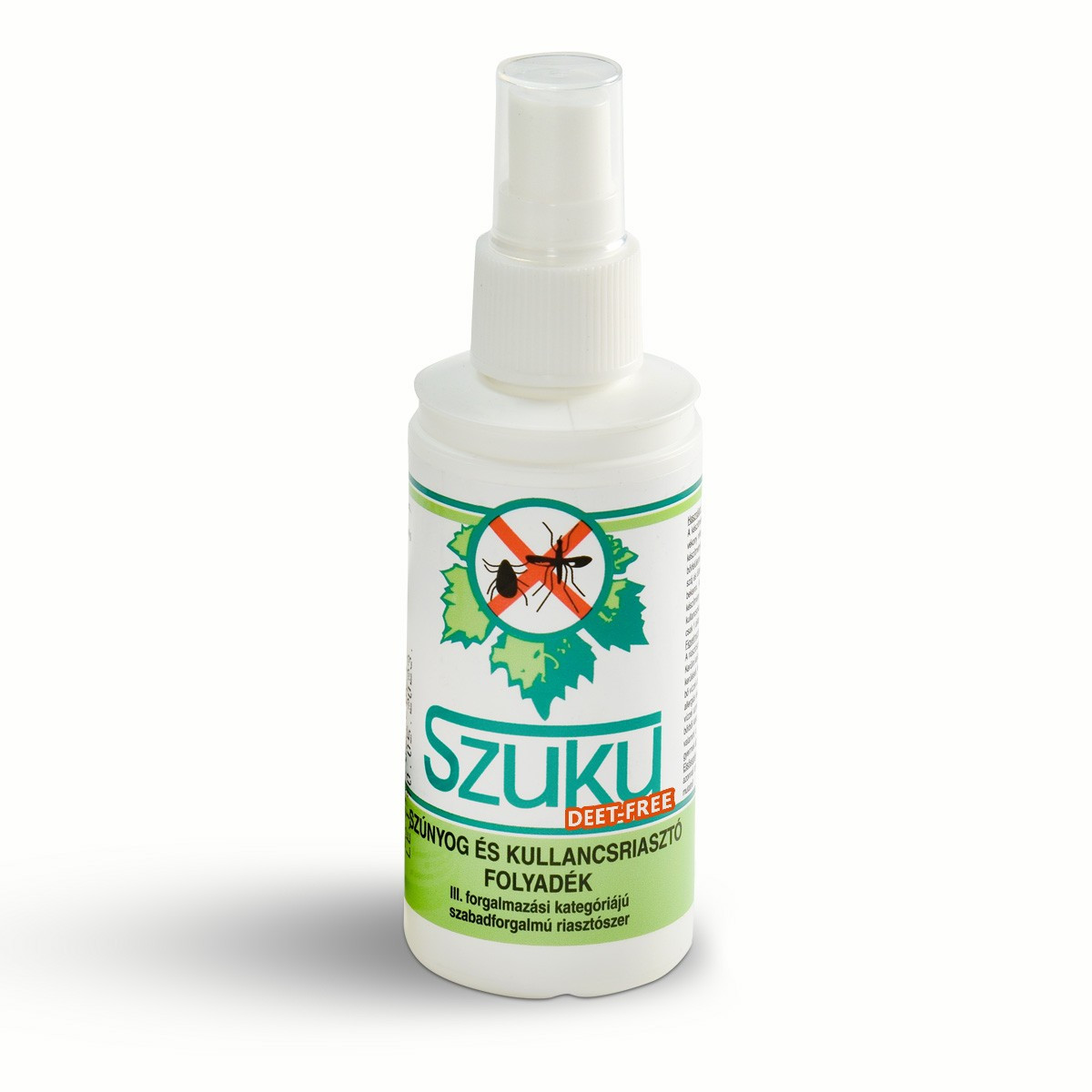 Спрей против комари и кърлежи Szuku Deet-Free е 100% натурален продукт на растителна основа. Продуктовата линия Szuku Deet-Free е перфектна, ако не и по-добра алтернатива на синтетичните репеленти за насекоми. Течността може да се използва против комари и кърлежи като се пръска върху кожата и дрехите, за да осигури дълготрайна защита дори в зони с висок риск срещу кръвосмучещи комари, кърлежи и други летящи и хапещи насекоми (различни видове мухи, земни пиявици и др.).