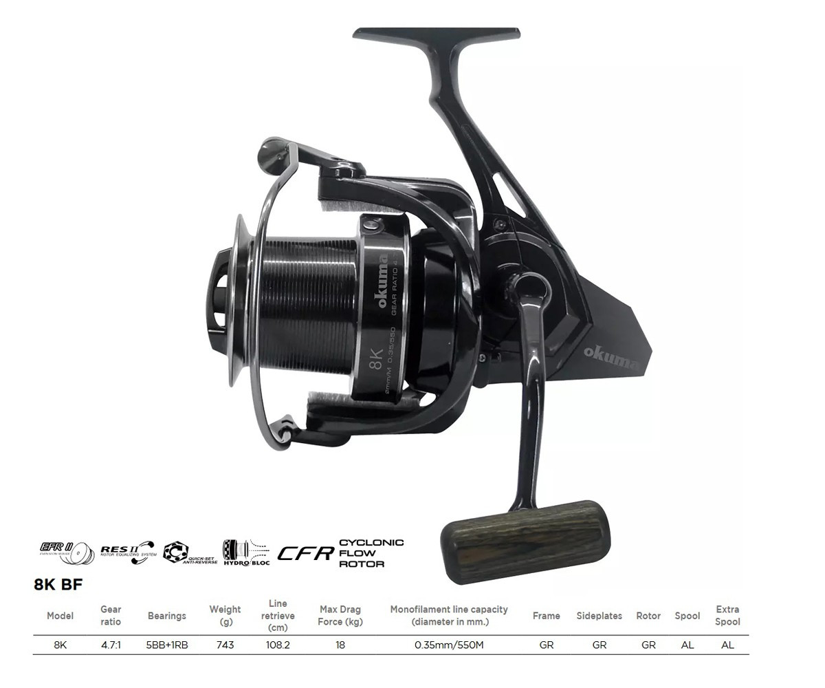 Концептуалната кастинг макара 8K включва не само патентованите дизайни на Okuma като Rotor Brake System, ротор с четкови предпазители, бързо настройваща се антиривърс система......, но също така надгражда всички функции и елементи. Макарата е снабдена с червячна предавка и система за супер бавна осцилация, в резултат на които намотките на влакното са по-прави и стегнати, a триенето при замятане се редуцира максимално. Конусната шпула за кастинг на далечни дистанции е идеална за замятане при широки водоеми.
