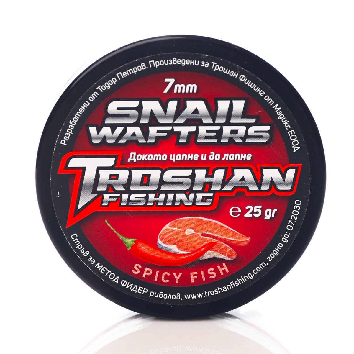 Търсите ли идеалната стръв, която да привлече и най-предпазливите риби? Snail Wafters Troshan Fishing - Spicy Fish 7mm е иновативно решение, създадено от Тодор Петров експерт в риболова на шарани с метод фидер. Тази стръв комбинира изключителен аромат, неустоима визия и перфектна плаваемост, за да гарантира успешен риболов дори в най-трудните условия. Продуктът е създаден да работи като неутрално балансирана стръв, която се носи точно над дъното и лесно попада в устата на рибата.