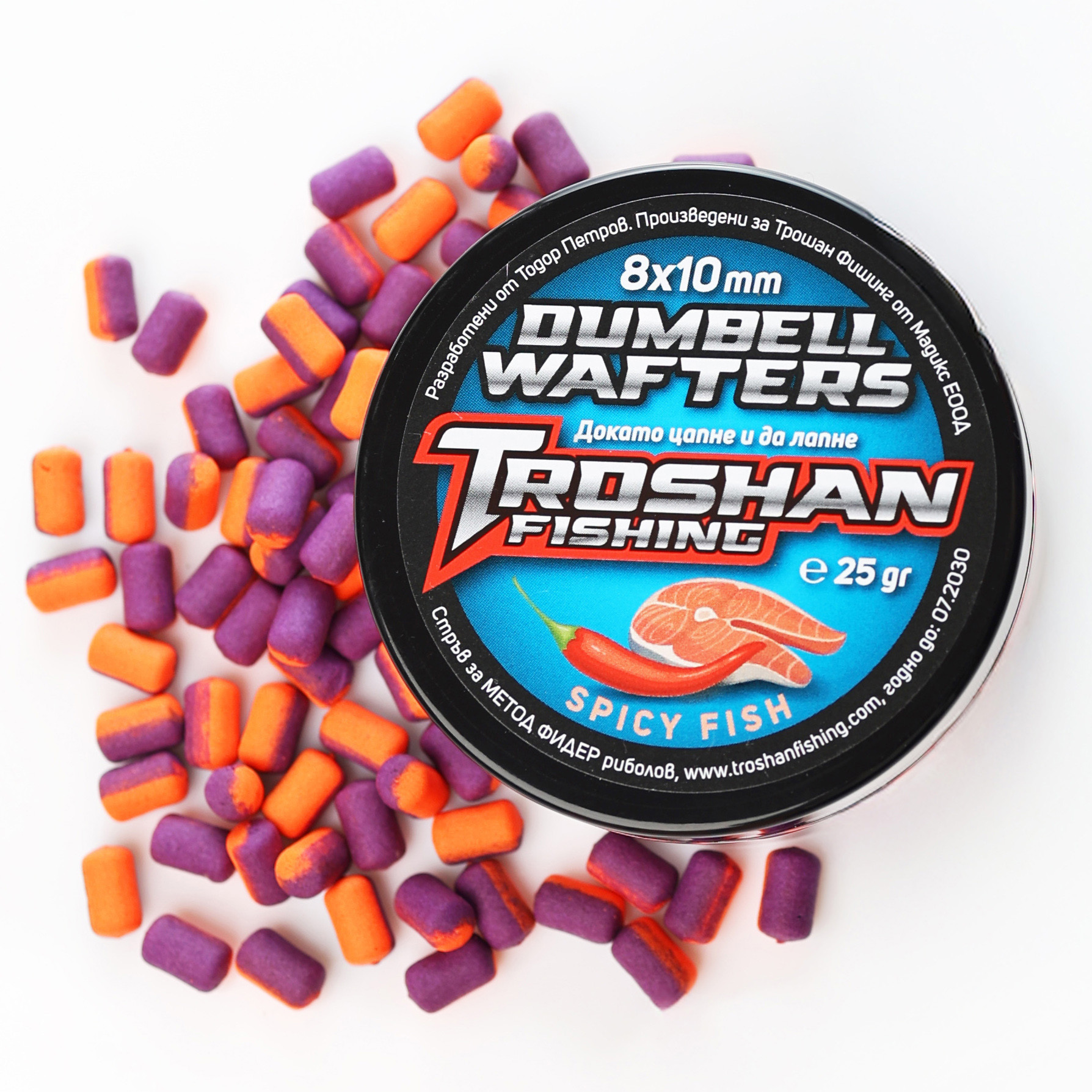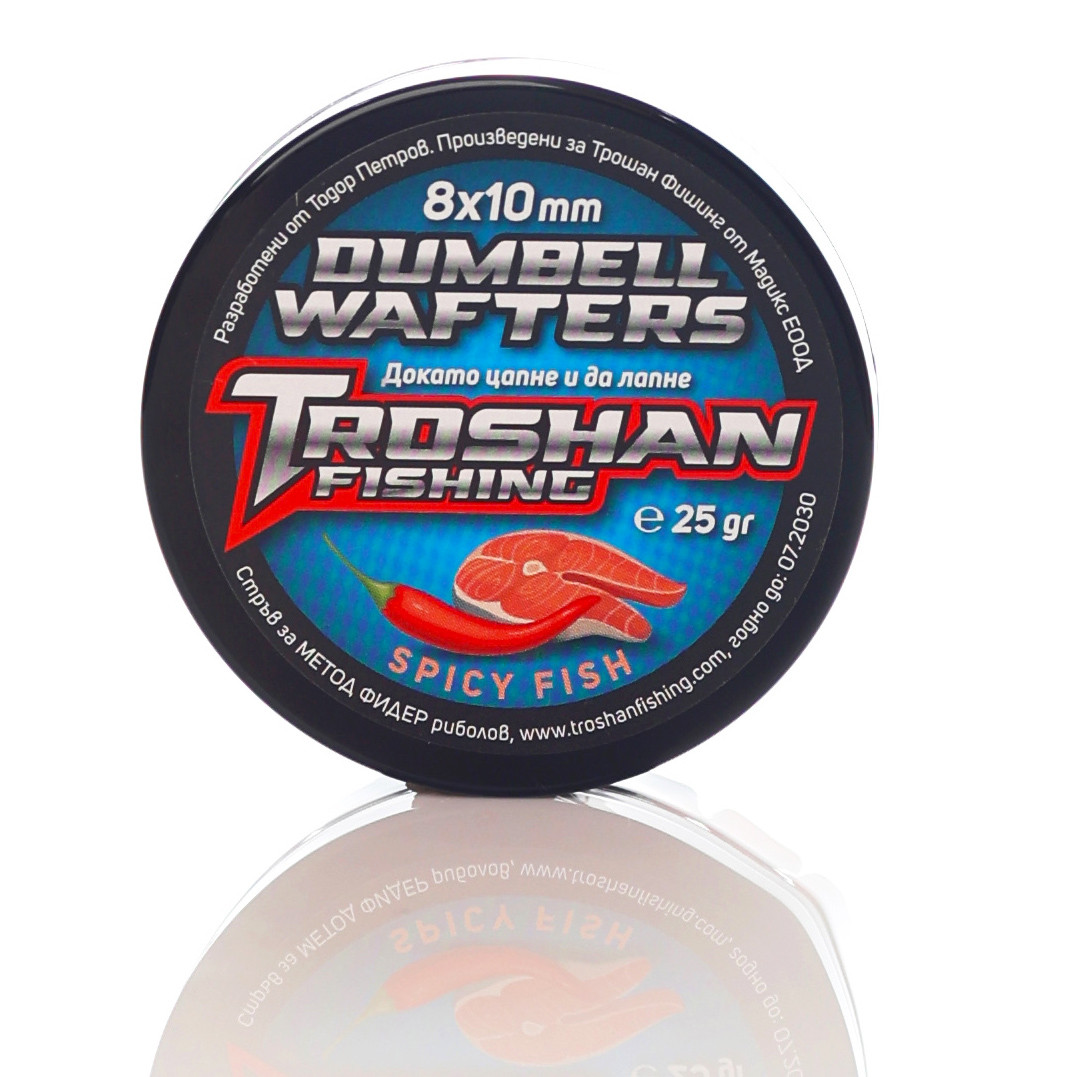 Ако търсите надеждна и атрактивна стръв за успешен риболов, Dumbell Wafters Troshan Fishing - Spicy Fish 8x10mm са перфектният избор. Те са специално създадени, за да комбинират правилната плаваемост и силен аромат, който провокира рибата да кълве. Тази серия от риболовни принадлежности е предпочитана от опитни риболовци, които искат да увеличат своите шансове за успешен улов.
