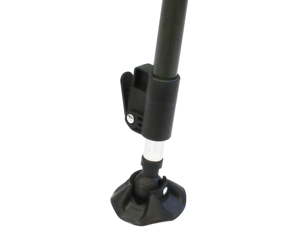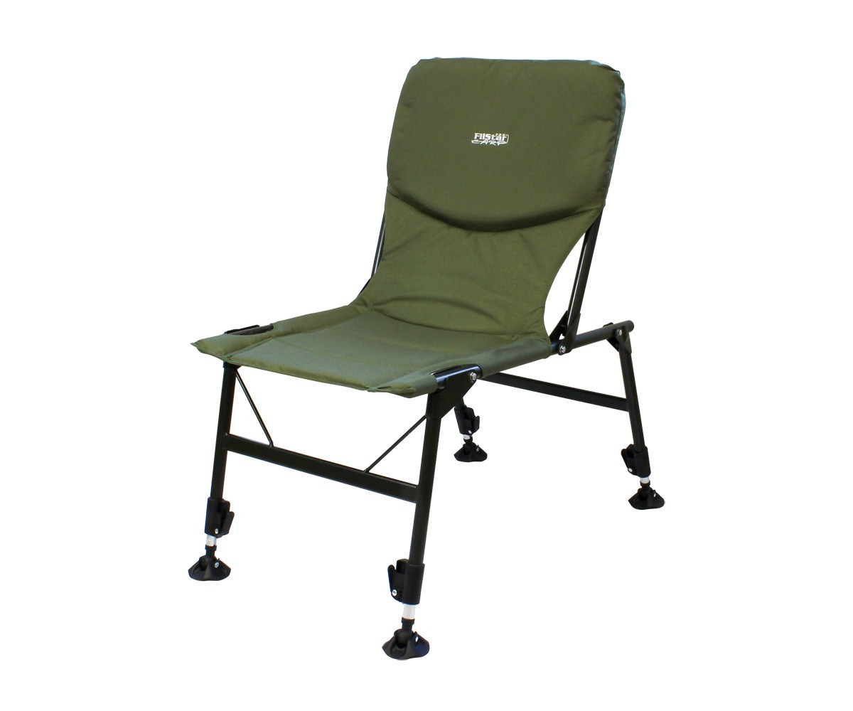Компактен стол за риболов, притежаващ здрава метална конструкция и мека подплата при седалката и облегалката.