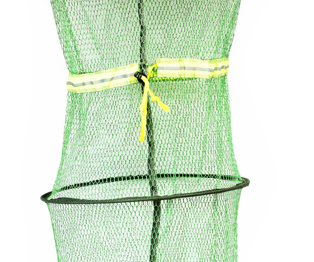 При втората секция има добавена връзка в сигнален цвят, която пристяга и затваря мрежата, за да не излиза рибата.